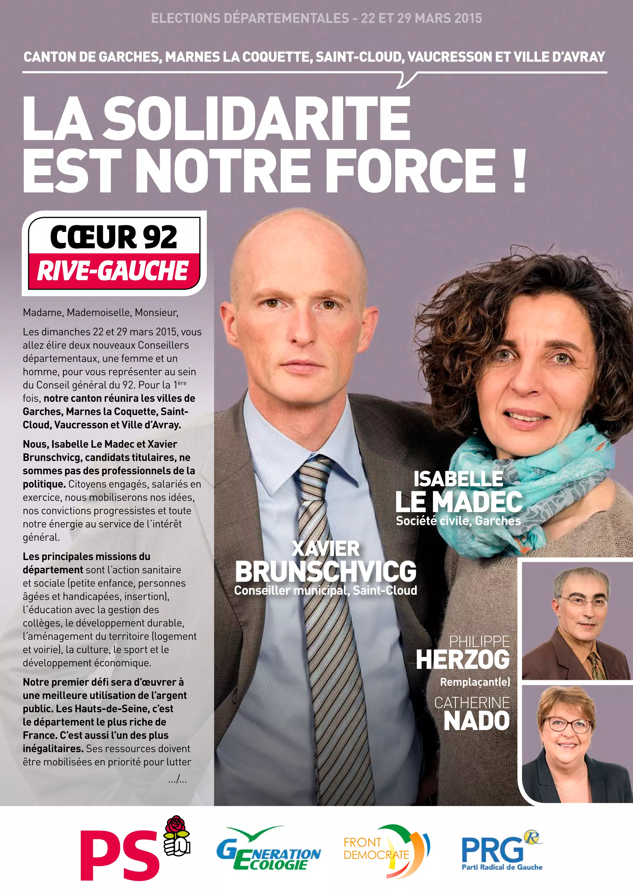 Les élections départementales des 22 et 29 mars 2015 viseront à élire deux conseillers départementaux pour le canton regroupant Garches, Marnes-la-Coquette, Saint-Cloud, Vaucresson et Ville-d'Avray. Les candidats, Isabelle Le Madec et Xavier Brunschvicg, s'engagent à œuvrer pour l'intérêt général, mettre fin au gaspillage et renforcer la solidarité dans un département riche mais inégalitaire, tout en préparant la création de la Métropole du Grand Paris. Leur programme comprend des priorités telles que l'amélioration des services aux seniors, la lutte contre les inégalités, et le développement durable.
