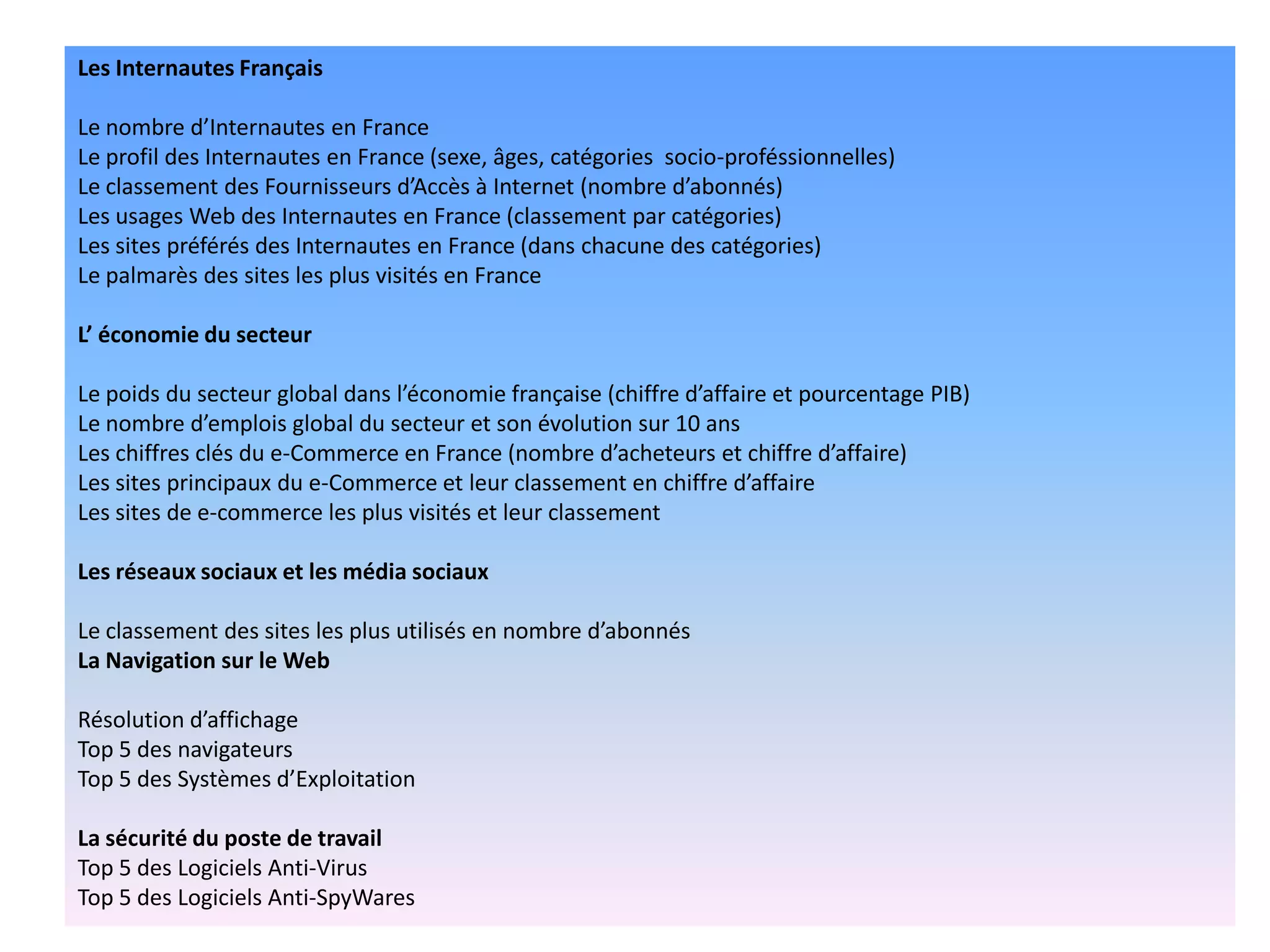 En France, le nombre d'internautes a atteint 48 millions en décembre 2012, avec une utilisation en moyenne de 27,7 heures par semaine. L'économie numérique, incluant l'e-commerce, représente une part significative du PIB français, estimée à 60 milliards d'euros, et présente un potentiel de croissance continue, notamment parmi les seniors qui deviennent de plus en plus connectés. Google domine le marché des moteurs de recherche avec 94% des requêtes, tandis que Facebook est le réseau social le plus utilisé, malgré la montée de concurrents comme Twitter et LinkedIn.