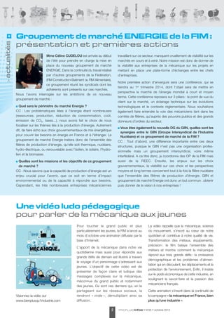 Le document aborde les défis et évolutions auxquels est confronté le secteur des équipements mécaniques, notamment les effets du ralentissement économique et l'importance de l'innovation pour s'adapter à un environnement changeant. Il détaille des initiatives comme le groupement de marché énergie, visant à donner de la visibilité aux entreprises du secteur sur les projets actuels et futurs, ainsi qu'une campagne de sensibilisation à la mécanique pour les jeunes. Enfin, il évoque des préoccupations concernant le marquage CE abusif et l'importance d'améliorer la réglementation pour protéger les fabricants conformes.
