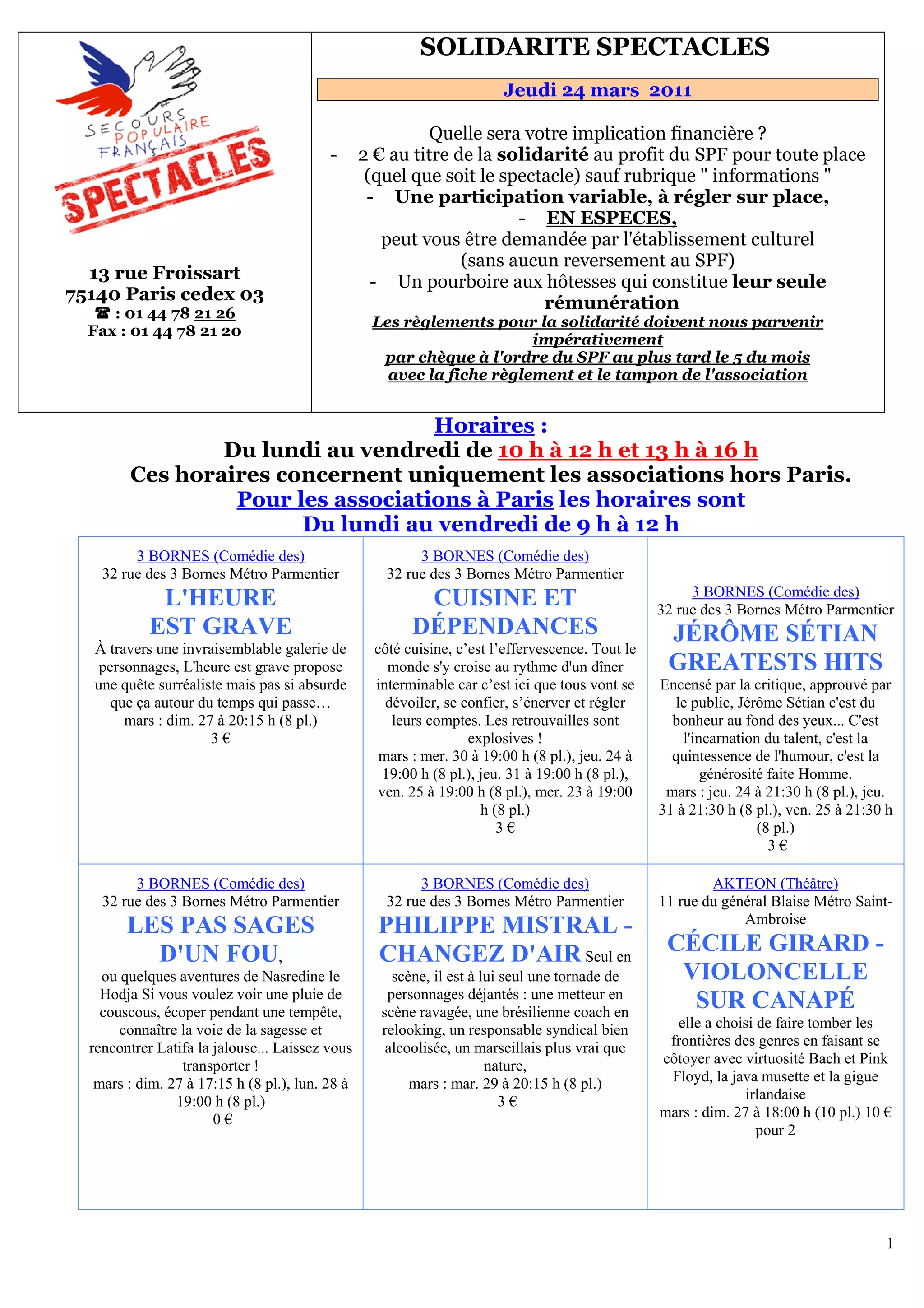Le document concerne le programme de spectacles et la participation financière pour des événements culturels au profit d'une association, avec des détails sur les horaires, les lieux et les prix des billets. Les spectacles mettent en avant divers artistes et genres, à travers des descriptions de pièces de théâtre et de concerts. Des informations pratiques sur les modalités de paiement et la réservation des places sont également fournies.