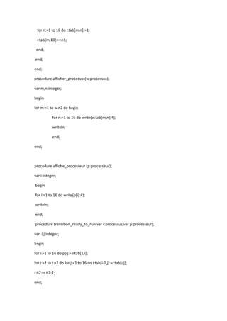 Le document est un programme en Pascal gérant un système de processus avec des états ready, run et wait. Il définit des procédures pour initialiser un processeur, remplir une matrice de processus, et gérer les transitions entre ces états. L'utilisateur peut interagir avec le programme via un menu pour manipuler les processus et afficher différentes informations.