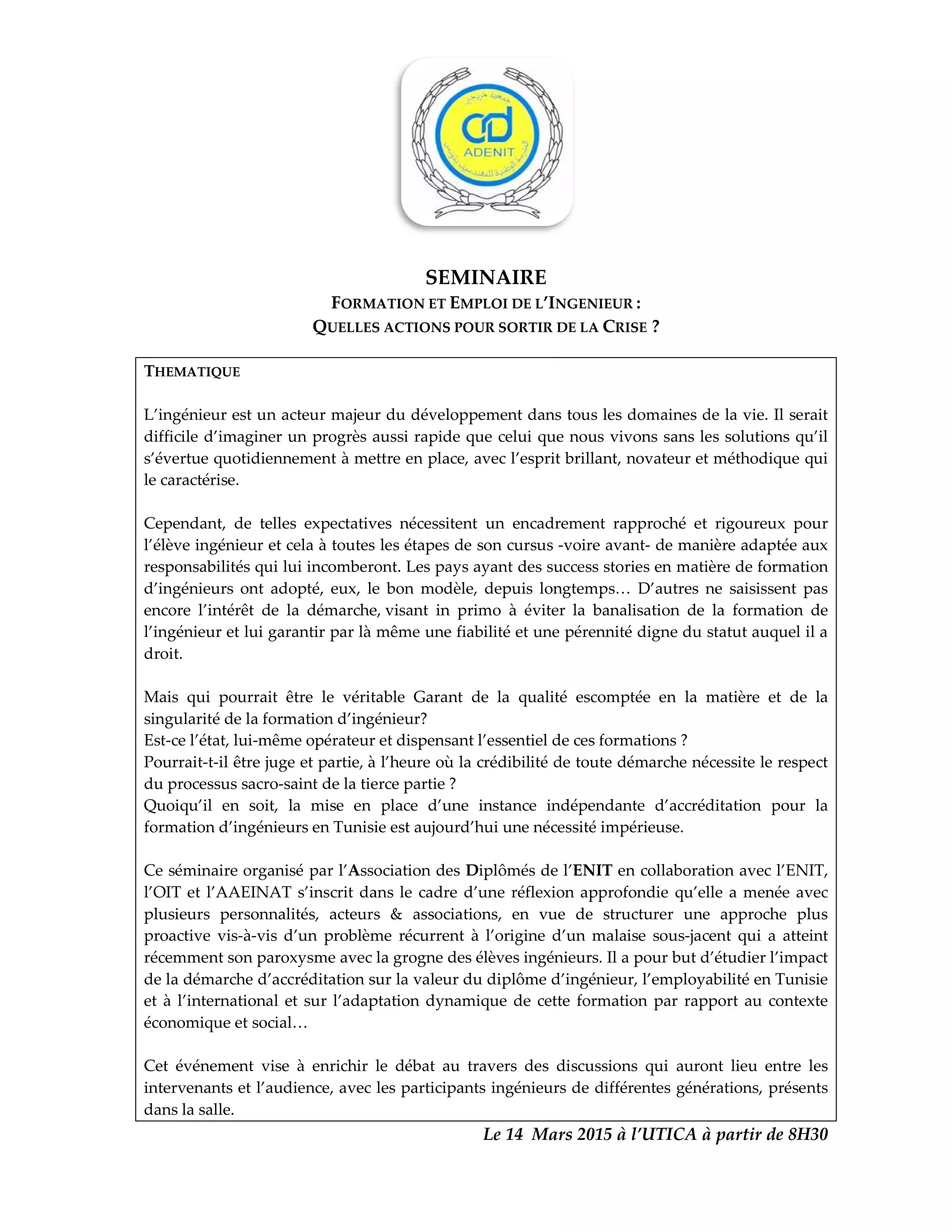 Le séminaire sur la formation et l'emploi des ingénieurs en Tunisie aborde la nécessité d'une accréditation indépendante pour garantir la qualité des enseignements et la valeur des diplômes. Il met en lumière les enjeux liés à la grogne des élèves ingénieurs concernant l'employabilité et l'adéquation des formations avec le marché. Des experts internationaux partagent leurs expériences d'accréditation pour structurer une approche proactive face aux défis actuels.