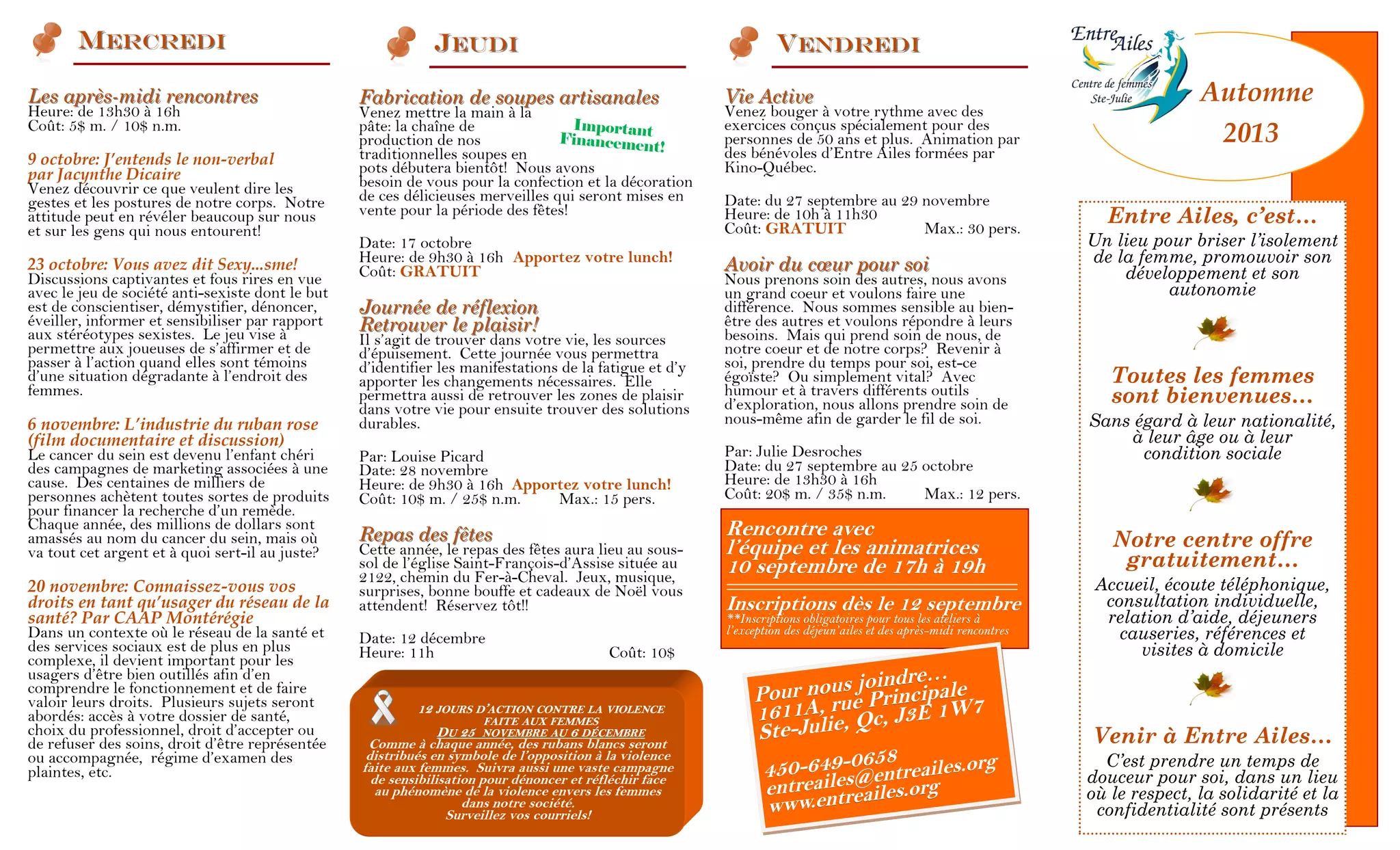 Le document présente les activités d'un centre pour femmes visant à briser l'isolement et promouvoir le développement personnel à travers divers ateliers et rencontres, ouverts à toutes les femmes. Parmi les activités proposées, on trouve des discussions sur la santé mentale, des ateliers créatifs et des événements pour sensibiliser à la violence faite aux femmes. Le centre offre également un soutien financier pour garantir l'accès à ses services, indépendamment des contraintes économiques.