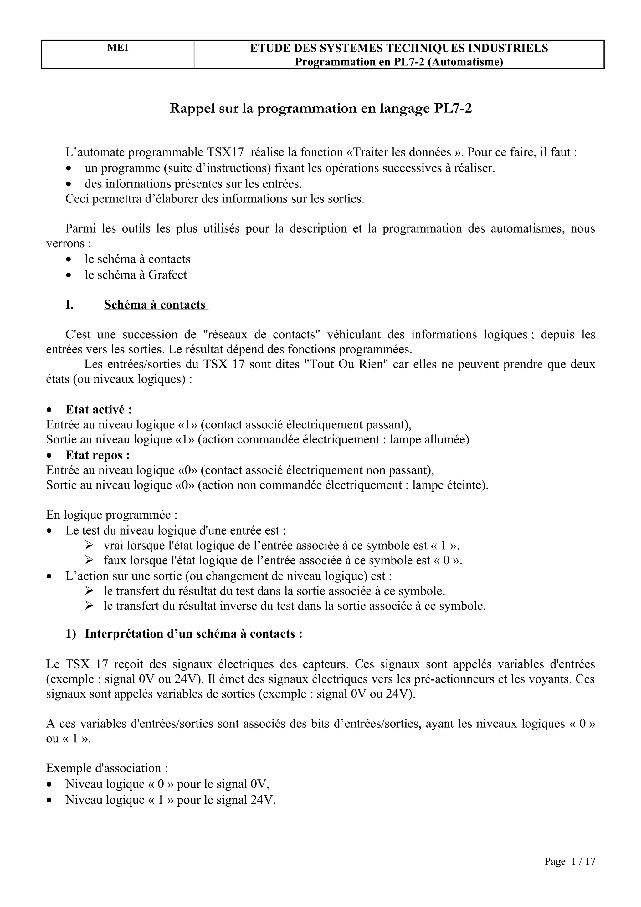 Le document traite de la programmation d'automatismes industriels à l'aide du langage PL7-2 pour l'automate TSX17. Il décrit les concepts fondamentaux de programmation, y compris les schémas à contacts, temporisation, et compteurs, ainsi que l'utilisation de Grafcet pour la décomposition d'automatismes séquentiels. Des exemples pratiques de programmation et des instructions sur l'utilisation du logiciel sont également fournis.
