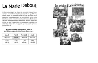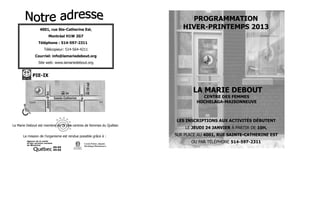 Le document présente les activités et programmes du centre La Marie Debout pour l'hiver-printemps 2013, offrant un espace de soutien et de socialisation pour les femmes de toutes origines. Les inscriptions aux activités débutent le 24 janvier, avec divers ateliers, sorties et initiatives de mobilisation pour les droits des femmes prévues tout au long de la saison. Le centre, fondé en 1982, se distingue par son approche inclusive et solidaire, sans dossiers ni diagnostics pour ses participantes.