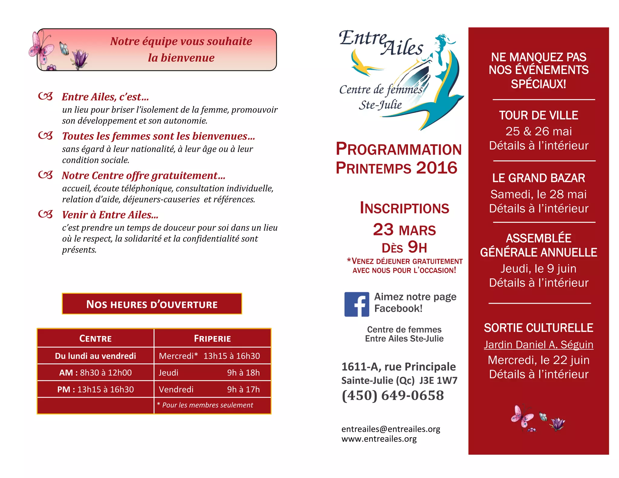 Le centre Entre Ailes est un espace dédié au soutien et à l'autonomisation des femmes, offrant divers services gratuits comme l'accueil, des consultations et des activités. Il organise également des événements spéciaux et des ateliers, abordant des thèmes variés tels que l'estime de soi, le stress et les relations interpersonnelles. Le centre invite toutes les femmes, sans distinction, à participer et à contribuer à une dynamique de solidarité et de partage.