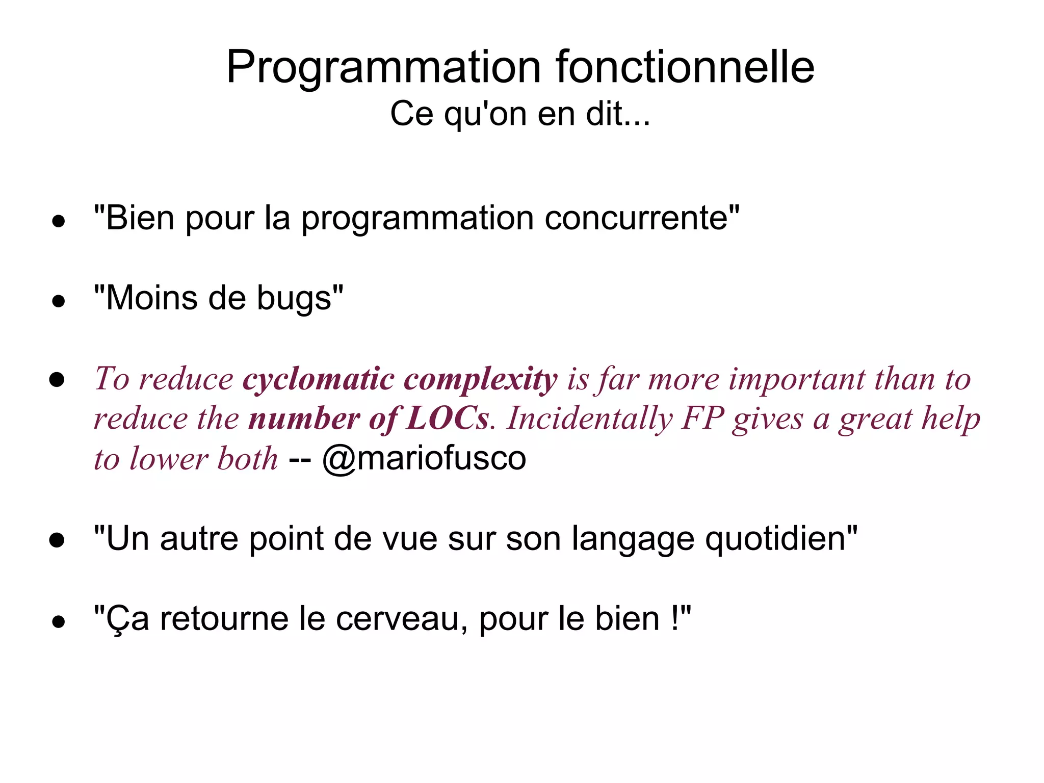 Le document présente une exploration approfondie de la programmation fonctionnelle, ses principes et ses avantages, notamment en termes de concision, déterminisme et modularité. Il y est également question des langages associés comme Haskell, Scala et Clojure, ainsi que des mises en œuvre concrètes à travers des exemples. Enfin, il aborde les défis d'apprentissage et les ressources disponibles pour les développeurs intéressés par cette approche.