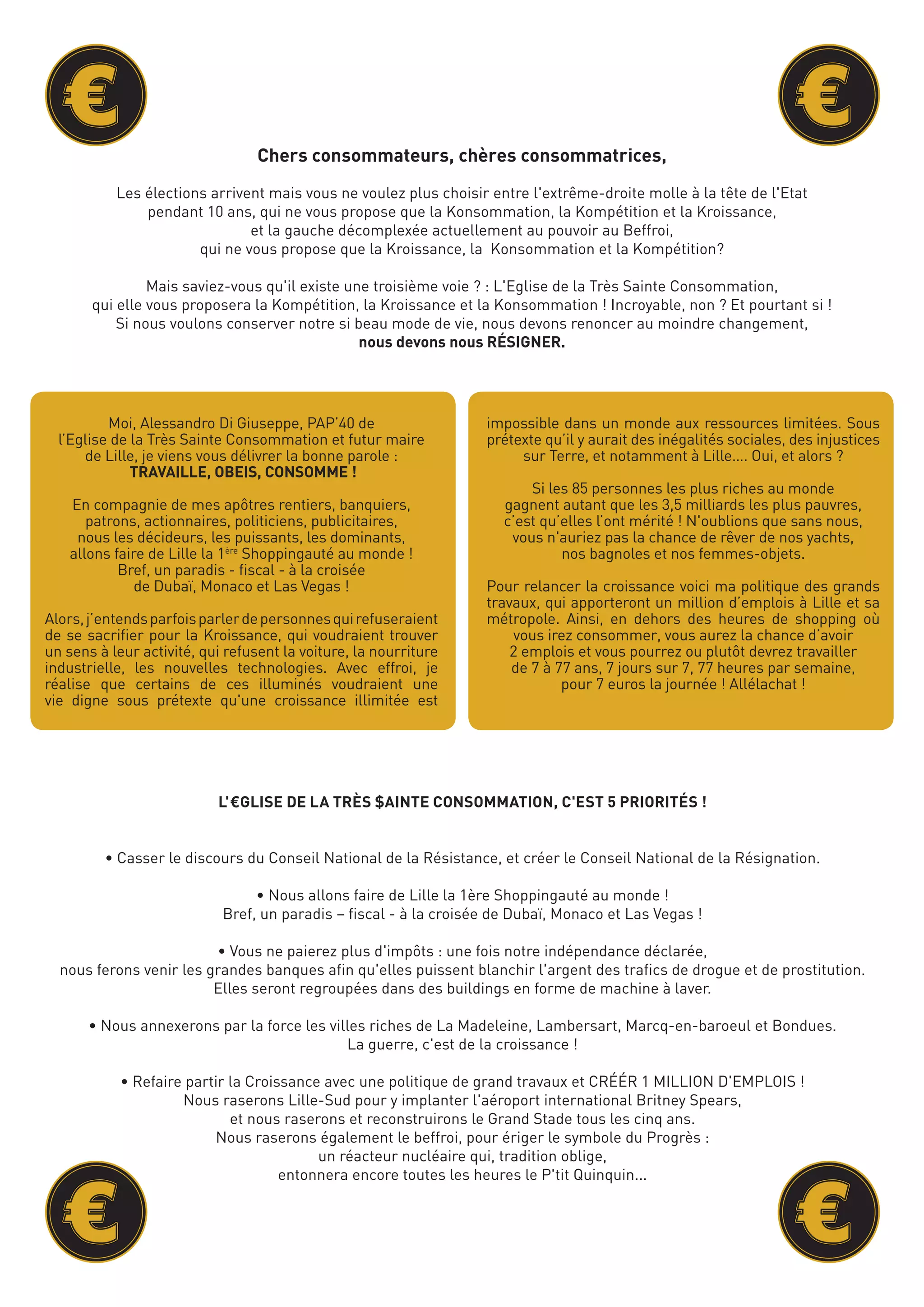 Le document satirique présente un discours exagéré d'un futur maire de Lille, Alessandro di Giuseppe, qui prône une société axée sur la consommation, la compétition et la croissance à tout prix. Il expose des idées provocatrices pour relancer l'économie, telles que le travail obligatoire pour tous de 7 à 77 ans à bas salaire, l'éradication des inégalités par des politiques de logements inaccessibles, et la glorification de la consommation débridée. Cette vision caricaturale met en lumière les excès et les dérives d'un système économique axé uniquement sur la croissance, sans égard pour les conséquences sociales et environnementales.
