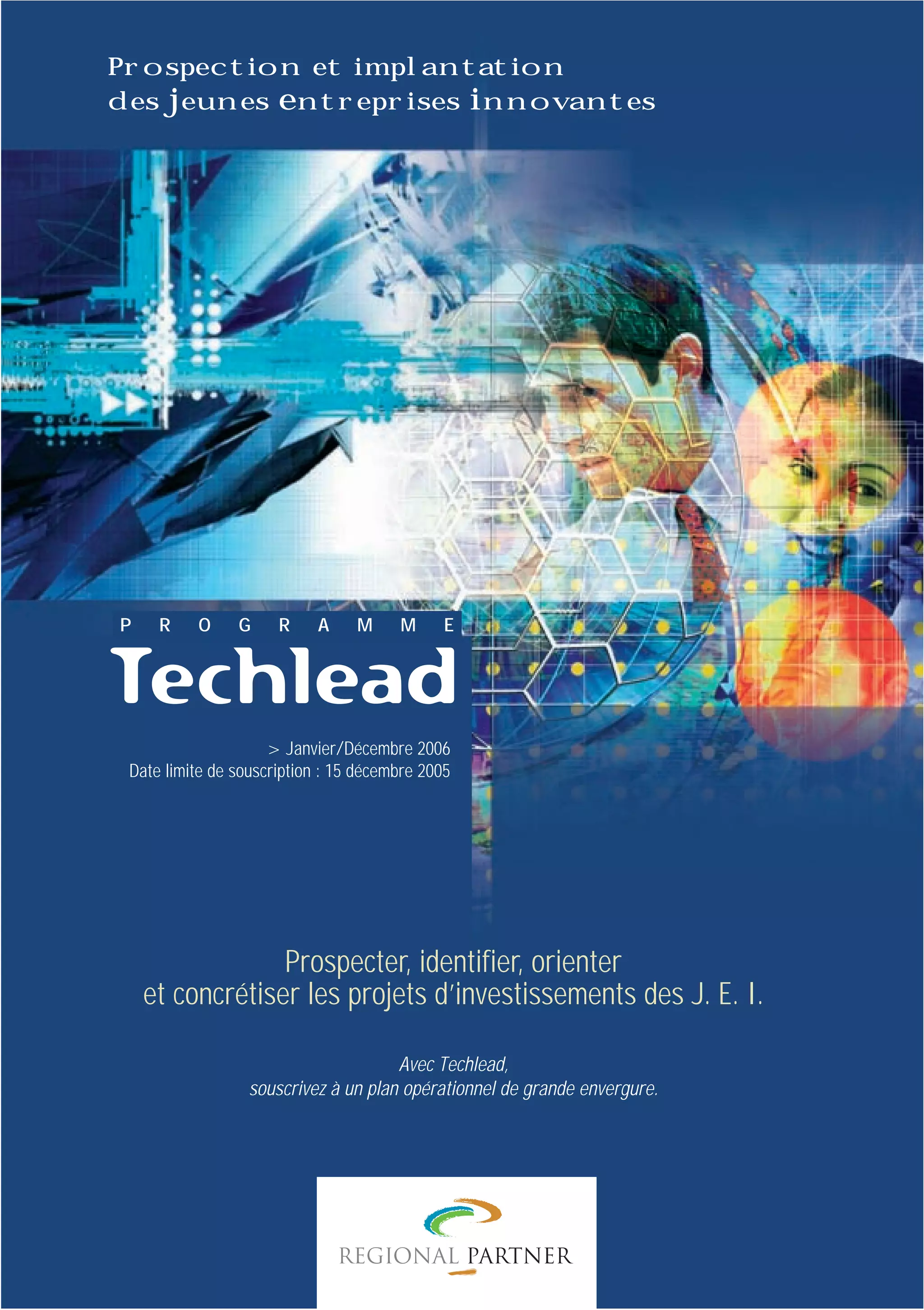 Le programme Techlead, lancé en 2006, vise à prospecter et soutenir l'implantation de jeunes entreprises innovantes en France, principalement celles de moins de 10 ans et de petite taille. Il s'appuie sur une base de données élaborée à partir d'enquêtes et d'analyses de marché, identifiant treize domaines d'activités dynamiques. Regional Partner, à l'origine du programme, a une solide expérience en prospection d'entreprises, ayant réalisé de nombreuses études de localisation et recherchant des solutions innovantes tout en gardant un souci de résultats concrets.