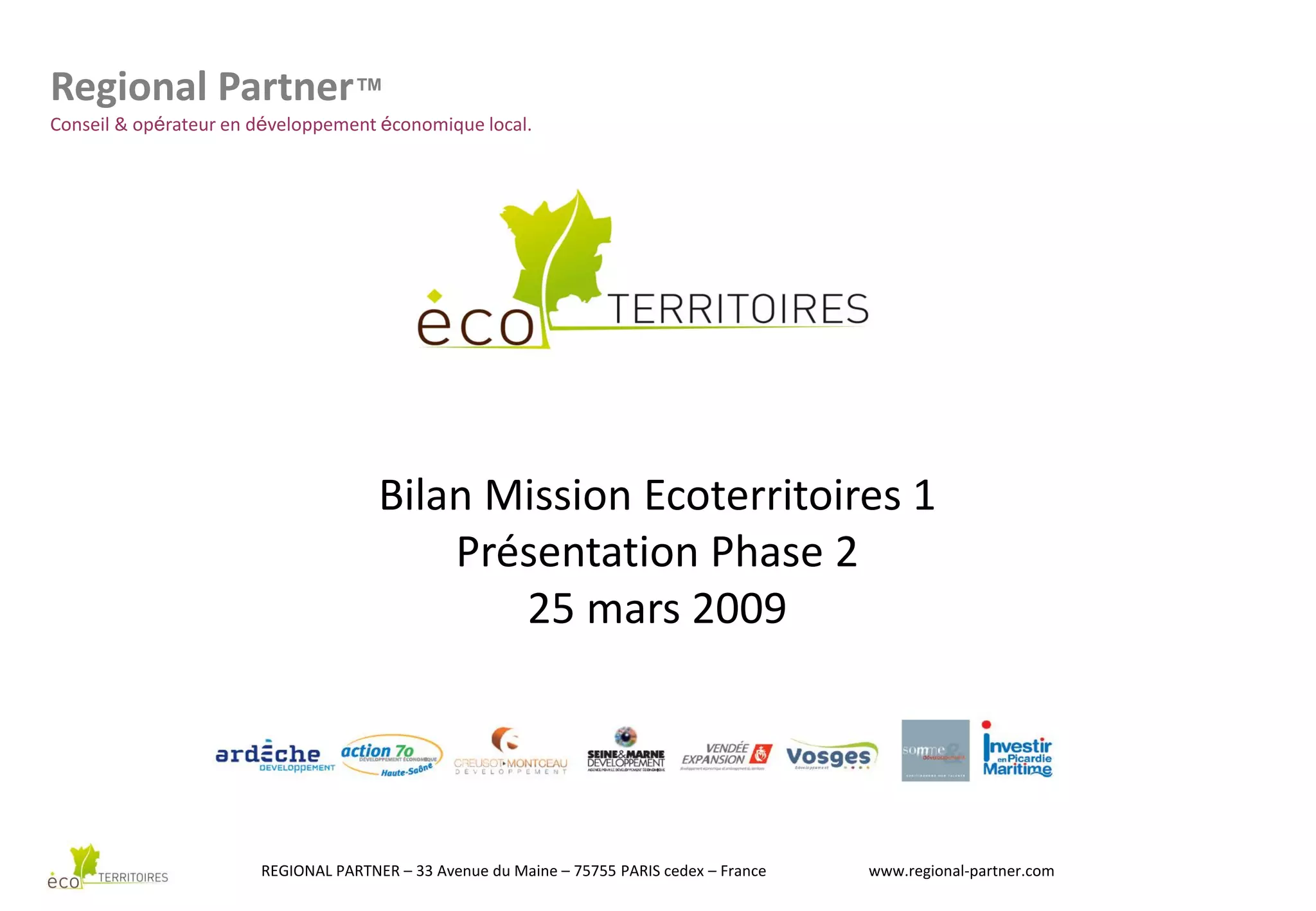 Le bilan de la mission Ecoterritoires, lancée en octobre 2008, montre la qualification de 64 projets d'implantation et d'autres actions de communication, telles que la création d'un site dédié et des campagnes de presse, afin de promouvoir les territoires partenaires dans les domaines du développement durable. Cette première phase a permis d'accroître la visibilité des partenaires lors des salons des énergies renouvelables, attirant plus de 49 500 visiteurs. La réflexion pour une seconde phase vise à maintenir cette dynamique malgré des contraintes budgétaires, tout en continuant d'optimiser les promotions et la prospection auprès des entreprises liées aux éco-activités.