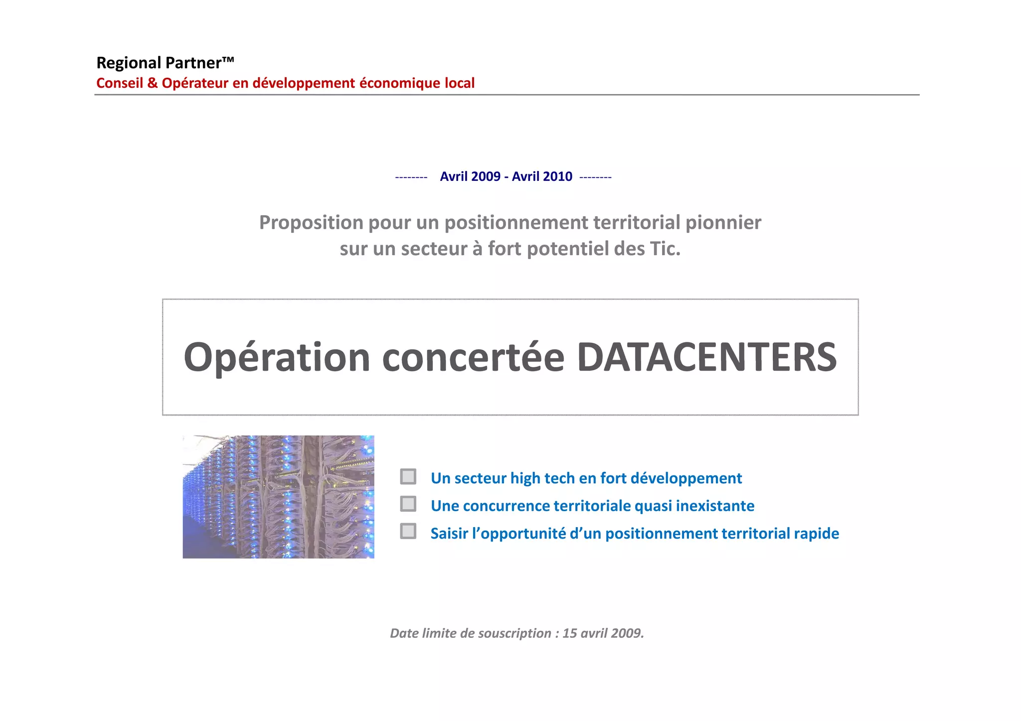 Le document présente une proposition pour positionner territorialement des datacenters en France, un secteur à fort potentiel de développement avec une concurrence quasi inexistante. L'étude souligne la nécessité d'agir rapidement pour saisir les opportunités, notamment par la rationalisation du secteur et la montée de la demande en matière de traitement et de stockage de données. Les efforts visent à promouvoir les offres territoriales et à identifier les projets d'implantation à court et moyen terme dans un cadre de collaboration entre partenaires territoriaux.