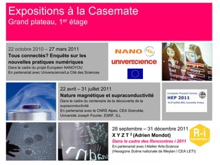 Le document présente les activités et expositions du centre de culture scientifique de Grenoble pour l'année 2011, incluant des projets sur les nouvelles pratiques numériques et la supraconductivité. Il détaille également les ateliers pour enfants et événements tels que la fête de la science et la création d'une plateforme pour rassembler des acteurs de la culture scientifique. Plusieurs partenariats avec des institutions locales et régionales sont mentionnés pour promouvoir la science et l'éducation.