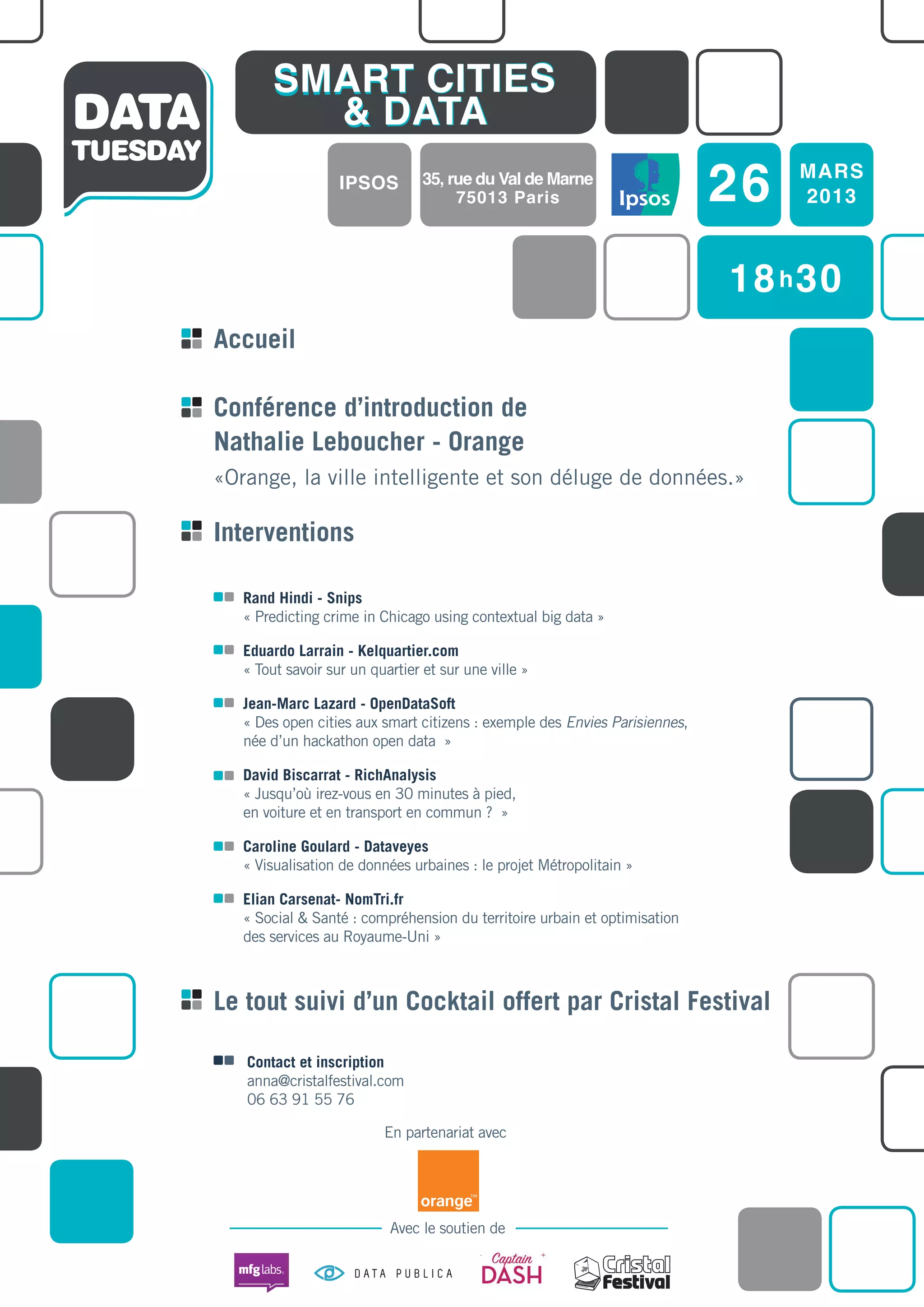 La conférence sur les villes intelligentes a eu lieu le 26 mars 2013, abordant divers aspects liés à l'utilisation des données dans l'urbanisme et les services urbains. Plusieurs intervenants ont partagé des exemples pratiques et des projets, tels que la prédiction de la criminalité et la visualisation de données urbaines. L'événement a permis aux participants d'explorer les innovations et les initiatives autour des smart cities et des open data.