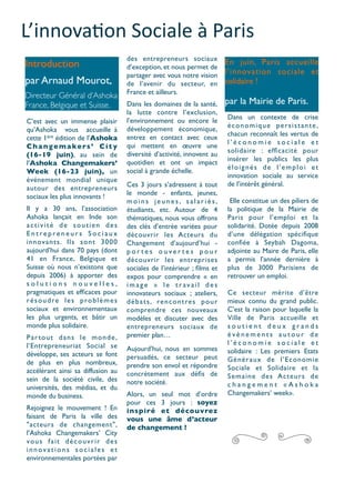 L'ashoka changemakers' city se déroule à Paris du 16 au 19 juin 2011 et présente l'entrepreneuriat social à travers 30 événements gratuits, visant à inspirer le public à devenir des acteurs de changement. Le programme met l'accent sur l'innovation sociale et réunit des entrepreneurs sociaux qui proposent des solutions à divers enjeux sociaux et environnementaux. Cet événement célèbre les 30 ans d'Ashoka, un réseau mondial d'entrepreneurs sociaux, en engageant la communauté dans des initiatives favorisant un impact social positif.