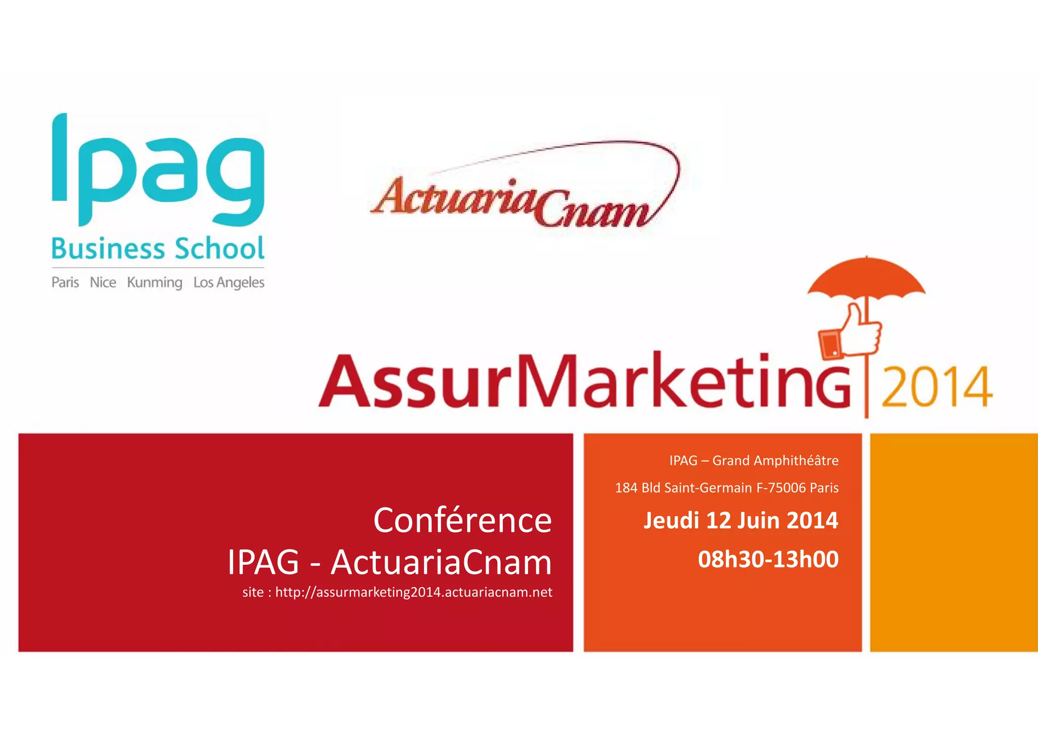 La conférence Assurmarketing 2014, organisée par l'IPAG Business School et l'Association Actuariacnam, se tiendra le 12 juin 2014 à Paris et se concentrera sur les innovations dans la relation client en assurance. Le programme couvre divers thèmes liés au marketing multicanal et au big data avec des intervenants de renom. Les participants auront également accès à des cadeaux et une opportunité de networking dans un cadre convivial.