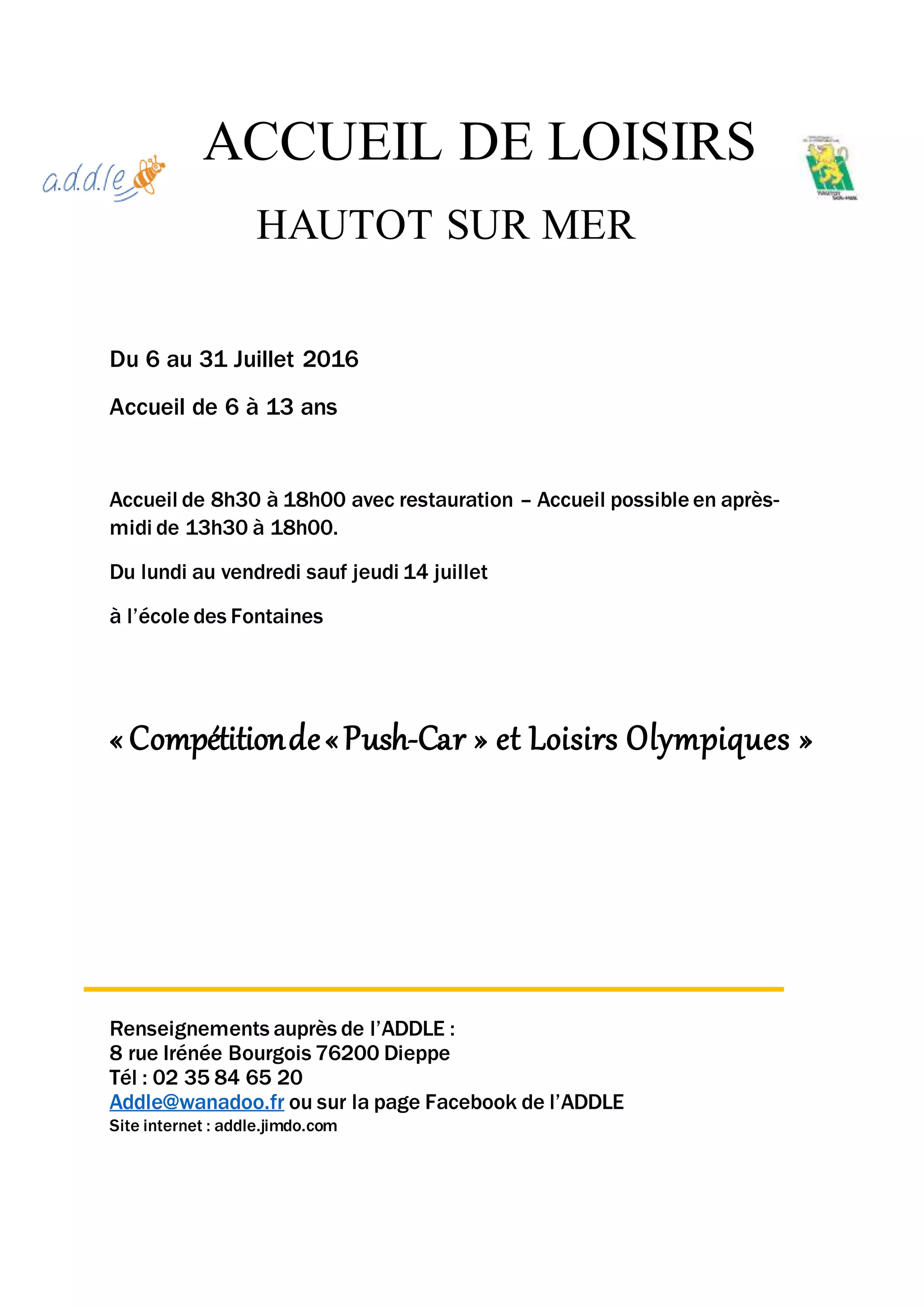 L'accueil de loisirs de Hautot-sur-Mer propose des activités pour les enfants de 6 à 13 ans du 6 au 31 juillet 2016, avec des horaires de 8h30 à 18h00. Diverses initiatives comme des jeux, des initiations sportives et des sorties sont organisées, ainsi qu'un camp équestre et des activités artistiques. Les tarifs dépendent du quotient familial et incluent des options de restauration et d'inscription auprès de l'ADDLE.