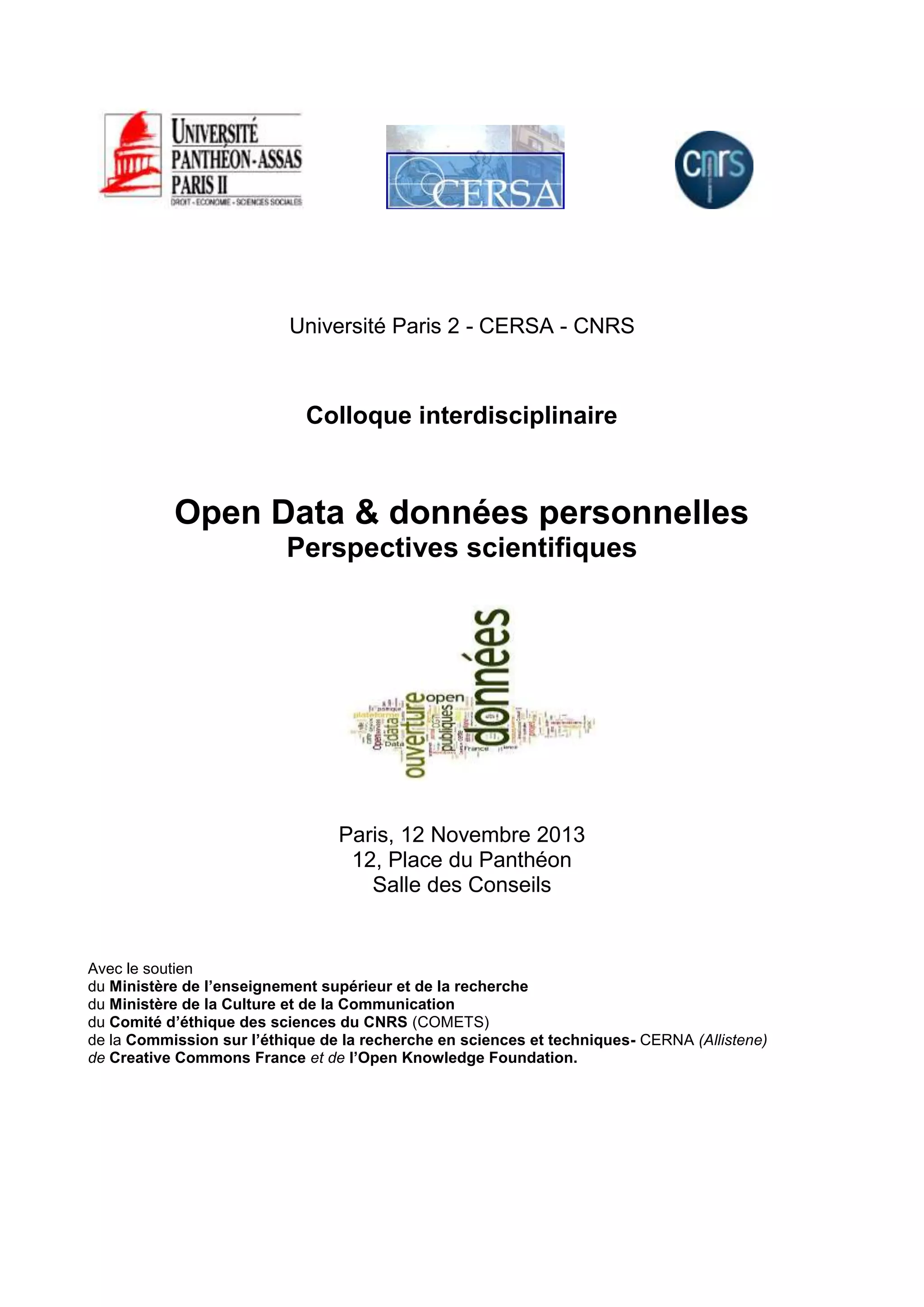 Le colloque interdisciplinaire organisé à l'Université Paris 2 en 2013 se concentre sur l'open data et la protection des données personnelles, en examinant les risques, enjeux et politiques associés. Les discussions incluent la transparence publique, les défis des big data et les garanties juridiques nécessaires pour la diffusion des données personnelles. L'objectif est de sensibiliser les chercheurs et décideurs aux impacts de l'open data sur les libertés fondamentales, notamment la vie privée.