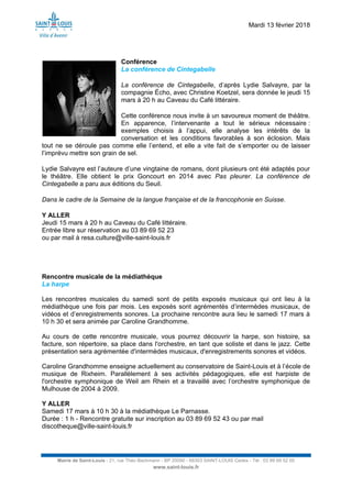 Le programme culturel de mars 2018 à Saint-Louis comprend diverses conférences, ateliers et concerts, tels que la conférence sur l'histoire contrefactuelle de 1917 et un atelier découverte du didgeridoo pour les enfants. Une variété d'événements artistiques, y compris des lectures théâtrales et des conférences sur l'art, sont prévus, ainsi qu'une exposition sur l'art contemporain à la Fondation Fernet-Branca. L'entrée est généralement libre, mais certaines activités nécessitent une réservation.