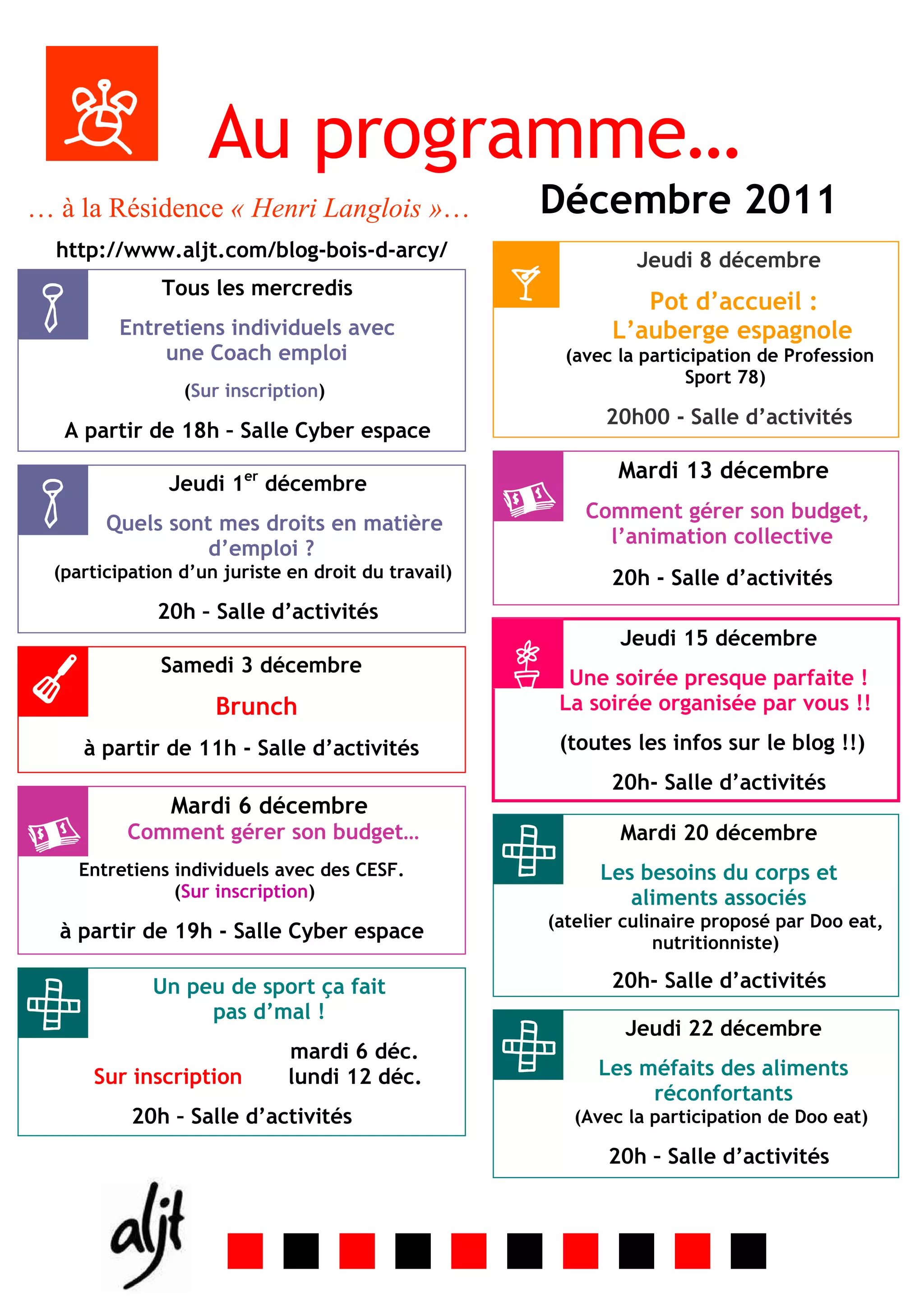 Le document décrit un programme d'activités à la résidence 'Henri Langlois' en décembre 2011, incluant des rencontres individuelles, des ateliers sur la gestion du budget et la nutrition, ainsi que des événements collectifs comme un brunch. Plusieurs sessions sont organisées tout au long du mois dans les salles d'activités et le cyber espace, avec des intervenants spécialisés. Les informations supplémentaires peuvent être consultées sur un blog dédié.