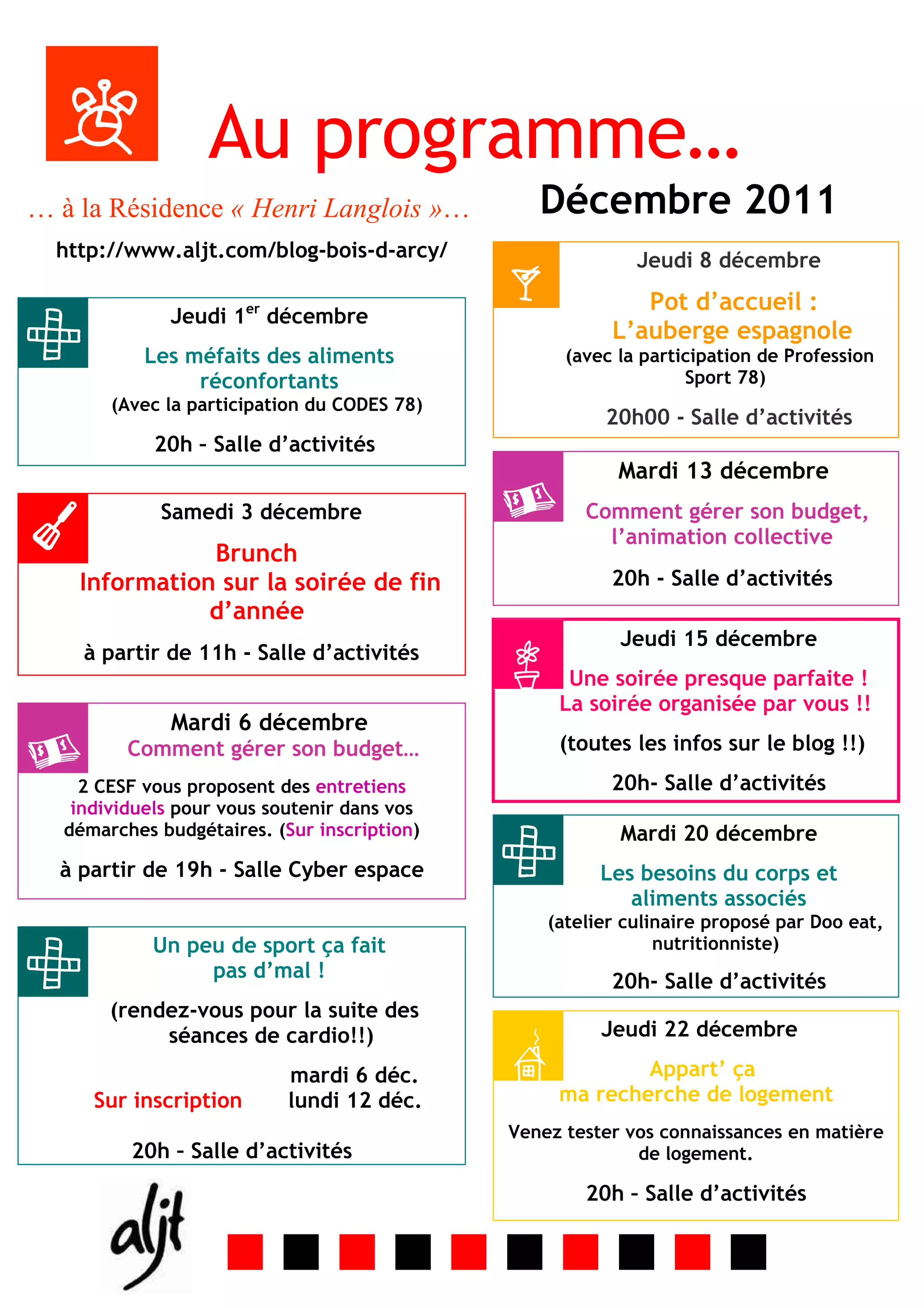 Le document présente un programme d'activités à la résidence « Henri Langlois » en décembre 2011, incluant des ateliers sur la gestion du budget, des séances sportives et des événements sociaux. Des entretiens individuels et des ateliers culinaires sont également proposés pour soutenir les résidents dans leurs démarches. Les activités se déroulent dans différentes salles et nécessitent parfois une inscription préalable.
