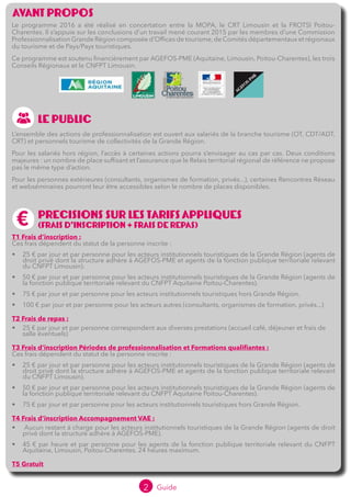 Le programme de professionnalisation pour la branche tourisme de la grande région Aquitaine-Limousin-Poitou-Charentes vise à répondre aux besoins en compétences des acteurs du secteur. Ce guide 2016 détaille les actions de formation, les modalités d'inscription, ainsi que les tarifs applicable selon les statuts, tout en introduisant des formats variés comme des webséminaires, formations d'intérêt régional et le parcours 'super manager'. Ce dispositif est soutenu par plusieurs partenaires, dont les conseils régionaux et AGEFOS-PME.