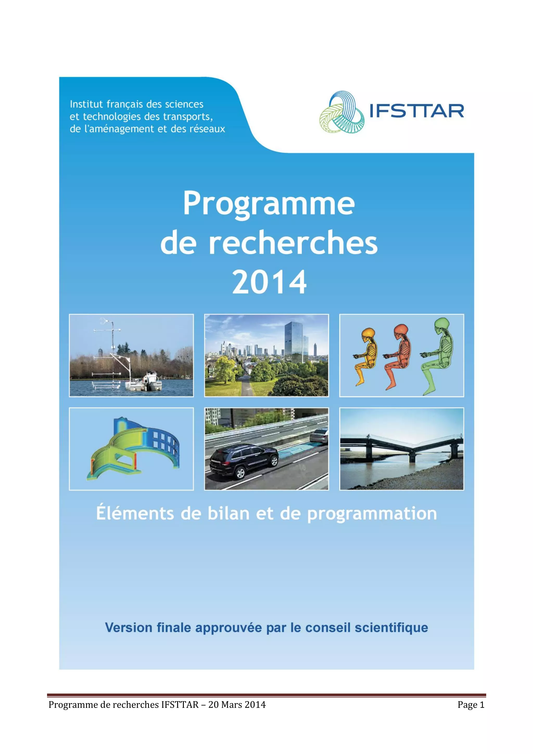 Le programme de recherche de l'IFSTTAR pour 2014 se concentre sur quatre axes principaux : mobilité durable, infrastructures efficaces, changement climatique et aménagement des territoires. Il s'inscrit dans un cadre stratégique de collaboration avec d'autres institutions, visant à renforcer l'innovation et le transfert des résultats de la recherche. Des outils de management sont également mis en place pour encourager la recherche pluridisciplinaire et la production de connaissances scientifiques reconnues.