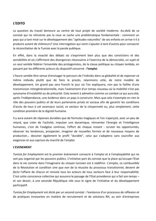 Le document traite de la problématique du chômage en Tunisie et appelle à repenser les parcours des individus dans le contexte d'un nouvel environnement économique. L'événement 'Tunisia for Employment' se positionne comme une initiative visant à réunir divers acteurs autour de l'emploi et de l'employabilité, soulignant l'importance de l'innovation et de l'engagement collectif. Il met en avant la nécessité d'une approche collaborative entre les pouvoirs publics et le secteur privé pour revitaliser le tissu productif et garantir l'accès à un ascenseur social.