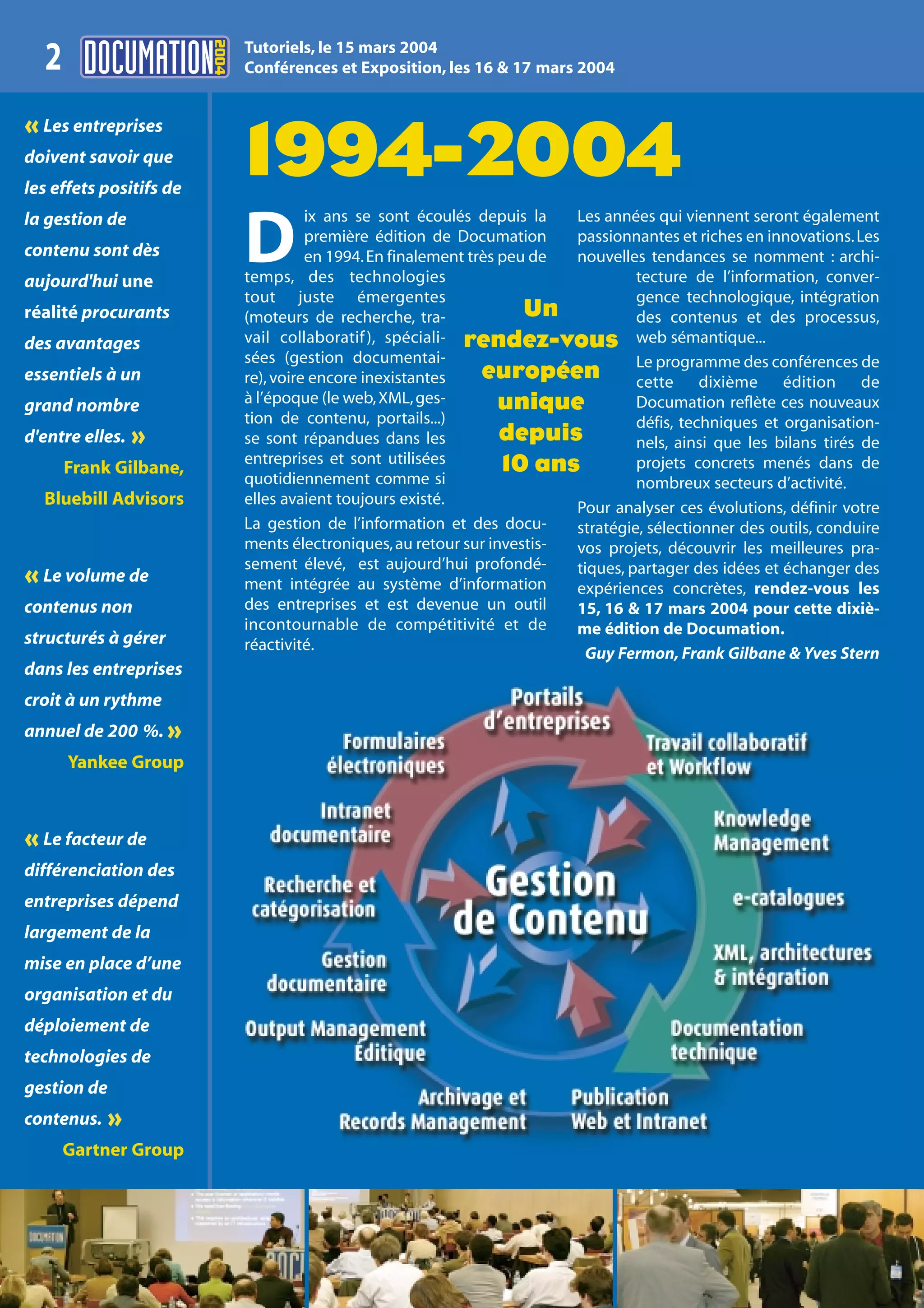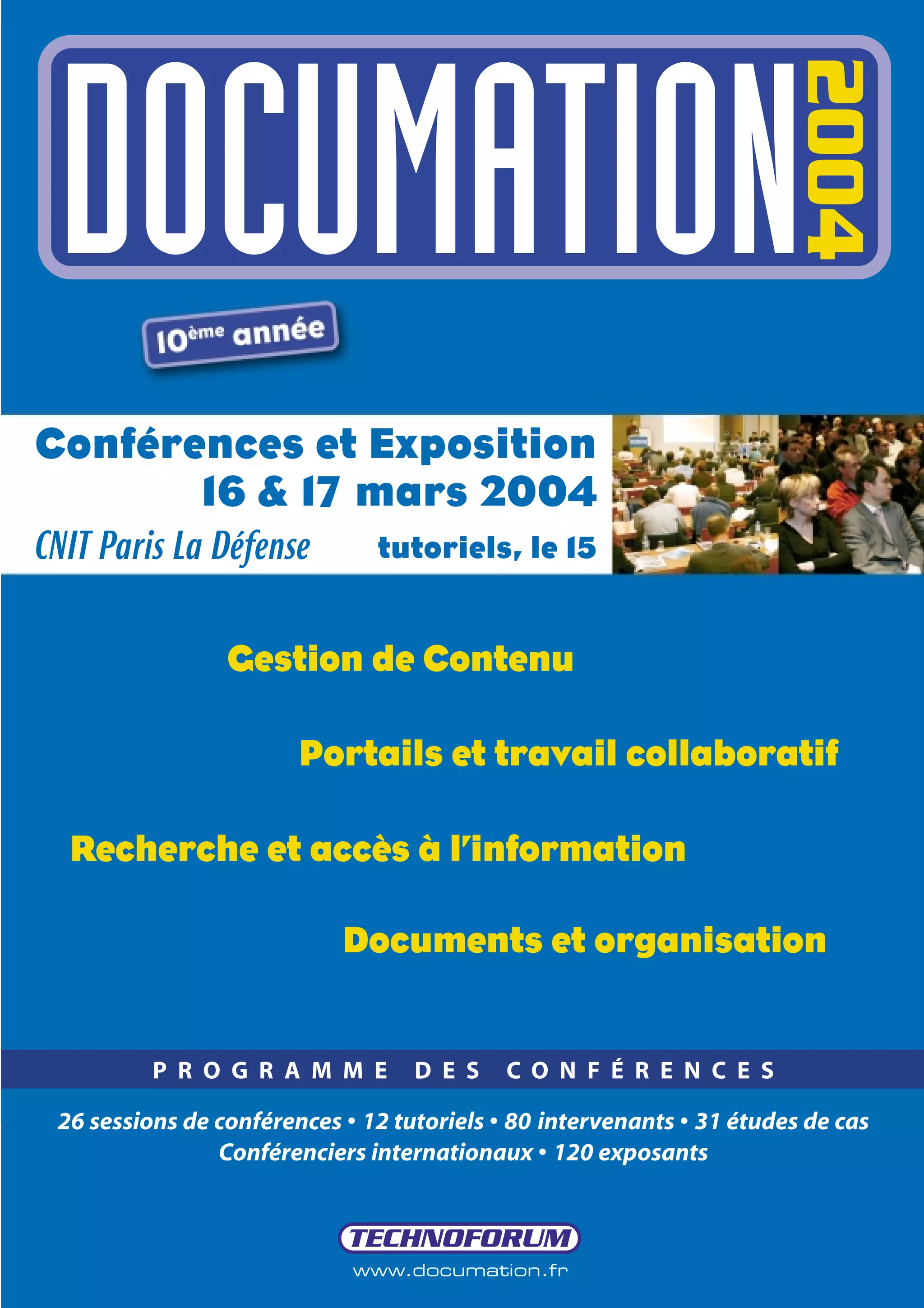 La conférence et exposition Documation 2004, qui se tiendra les 16 et 17 mars à Paris, inclut 26 sessions de conférences, 12 tutoriels et 80 intervenants, couvertes par divers thèmes liés à la gestion de contenu et aux technologies de l'information. Les événements de cette dixième édition visent à explorer les évolutions récentes dans le domaine à travers des études de cas et des sessions de formation animées par des experts. L'inscription donne accès à des ressources éducatives et à des échanges professionnels enrichissants, tout en répondant aux enjeux actuels des entreprises.