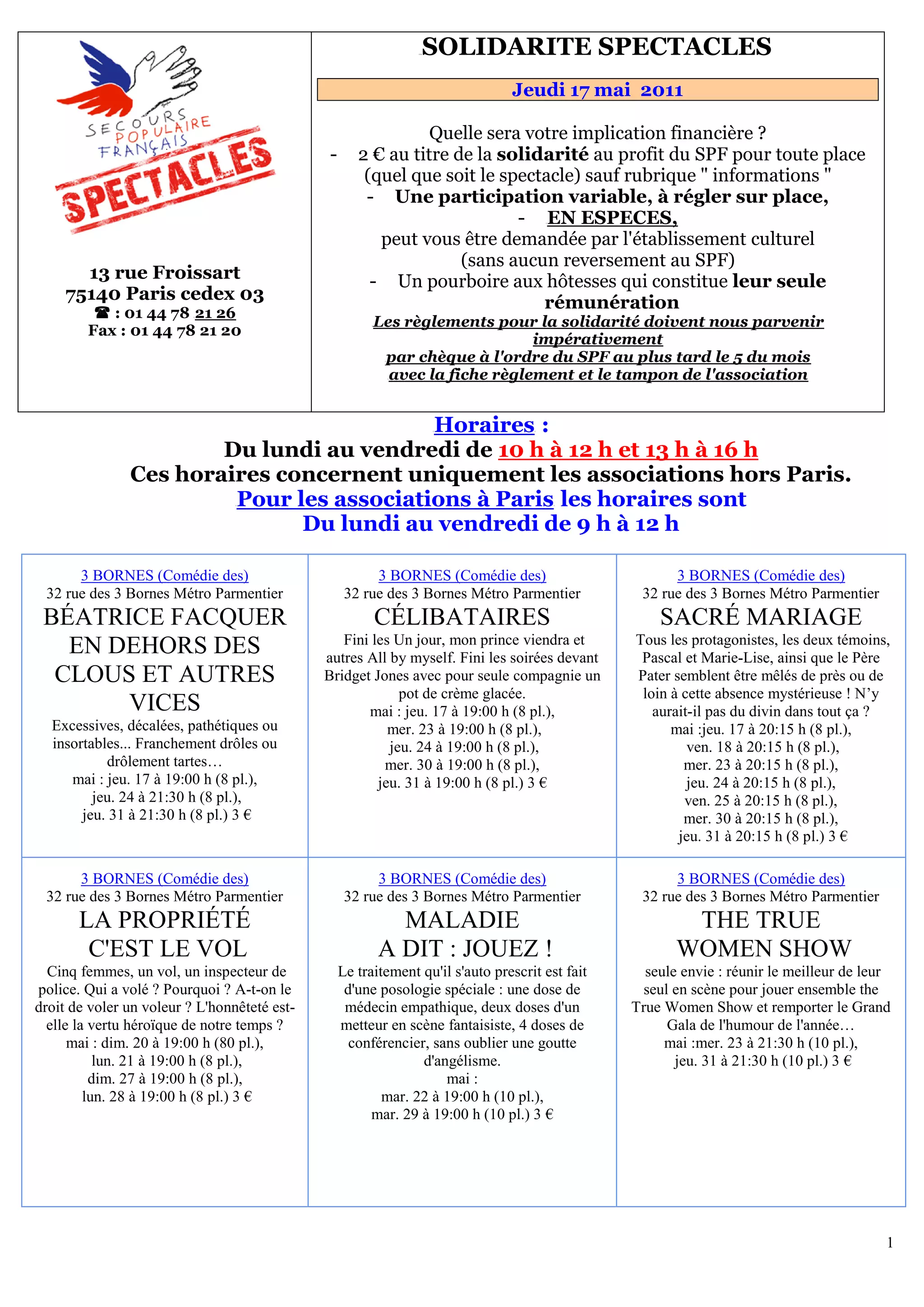 Le document fournit des informations sur des spectacles et des événements culturels, en détailant les coûts et les modalités de participation, notamment une contribution de solidarité de 2 € par billet. Il inclut des horaires de représentations, des descriptions d'œuvres théâtrales et des intervenants, ainsi que des détails pratiques pour les réservations et les paiements. Les spectacles couvrent une variété de thématiques allant de la comédie à la tragédie, destinés à différentes audiences.