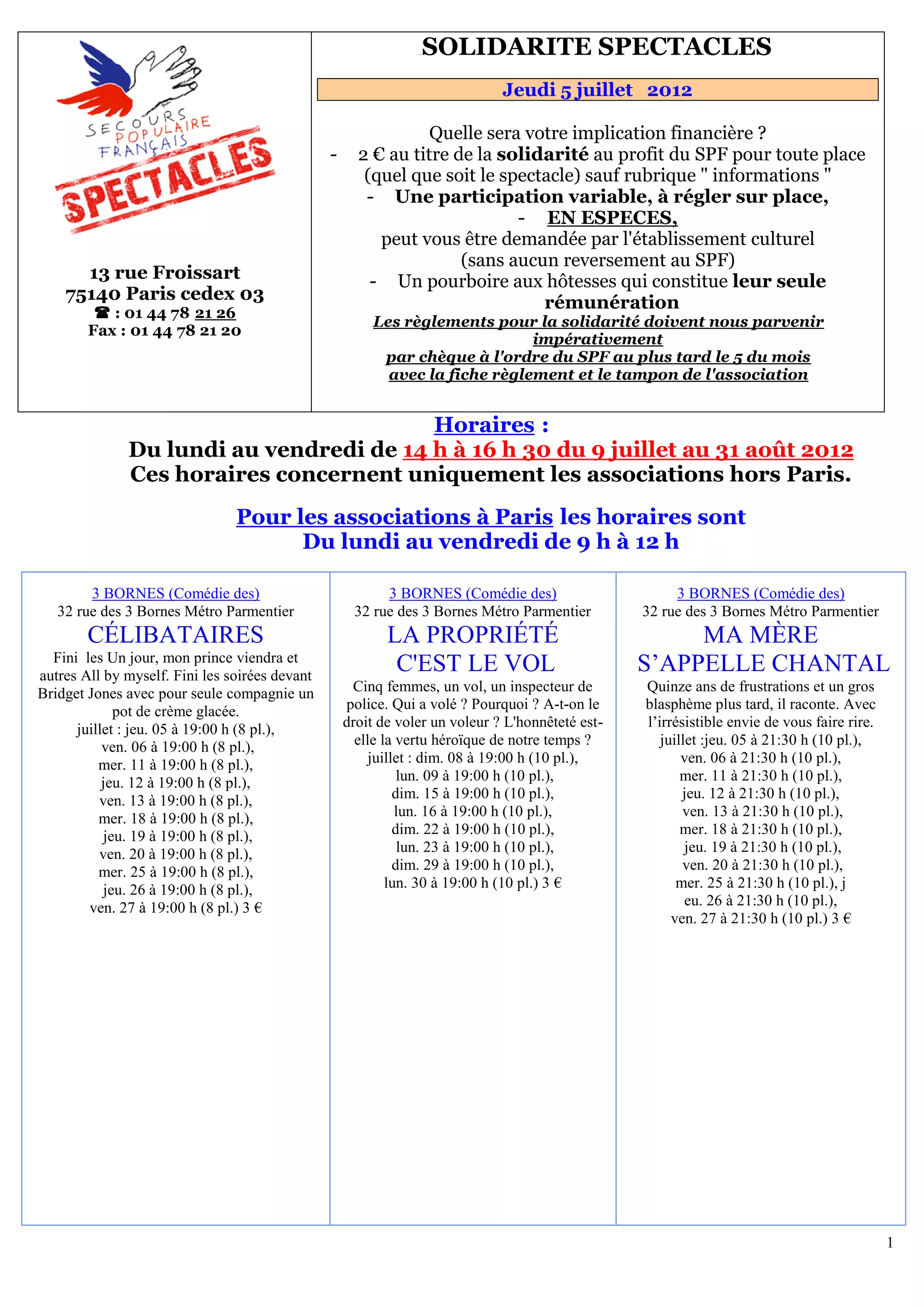 Le document décrit un événement culturel se déroulant à Paris, avec une implication financière de 2 € pour la solidarité au profit d'une association. Les horaires et modalités de paiement pour les associations ainsi que les détails de diverses représentations théâtrales sont également fournis. Plusieurs spectacles, incluant comédies et spectacles pour enfants, sont programmés entre juillet et août 2012.