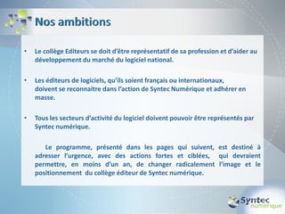 Le programme du collège éditeurs vise à représenter les éditeurs de logiciels et à promouvoir le développement du marché en France. Il propose une série d'actions ciblées pour améliorer l'image et le positionnement du secteur, ainsi qu'un baromètre de la croissance des éditeurs. Des outils de communication et de lobbying seront mis en œuvre afin de sensibiliser les pouvoirs publics et de fédérer les acteurs du secteur.