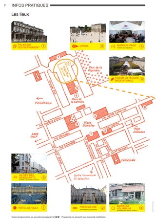 Le document présente la programmation du festival 'Le Livre sur la Place', avec des événements tels que des lectures, des débats et des expositions se déroulant à Nancy. Il inclut également des informations sur divers auteurs, des lieux d'exposition et les modalités d'accès aux événements. La programmation est sujette à modification et les détails peuvent être consultés sur le site www.lelivresurlaplace.fr.