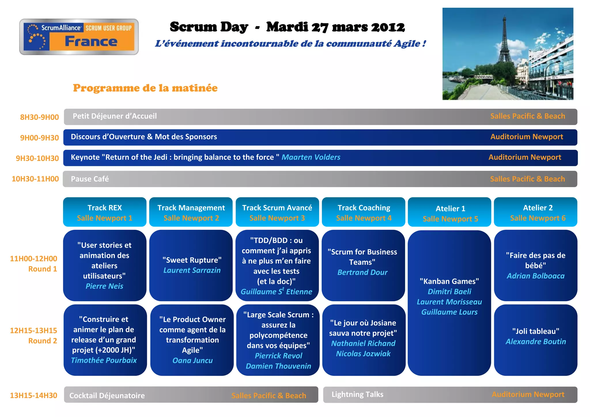 L'événement 'Scrum Day' se tiendra le mardi 27 mars 2012, mettant en avant des discours, des ateliers et des discussions autour de la méthodologie agile. Le programme inclut une keynote, des séances de coaching, et des ateliers variés tout au long de la journée. Les participants auront également l'occasion de se rencontrer lors de pauses café et d'un cocktail déjeunatoire.
