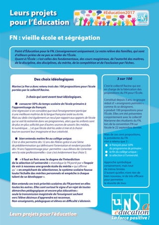 Marine Le Pen a retenu trois propositions idéologiques du collectif Racine pour l'éducation, axées sur l'apprentissage du français, la fin du collège unique, et la sélection à l'université, ce qui marque un retour à des méthodes éducatives traditionnelles et autoritaires. Ces changements favorisent une école à deux vitesses en renforçant l'élitisme et en négligeant les besoins des élèves en difficulté. Le projet éducatif du FN se concentre sur la transmission magistrale et la valorisation du mérite, tout en évitant des propositions véritablement nouvelles.