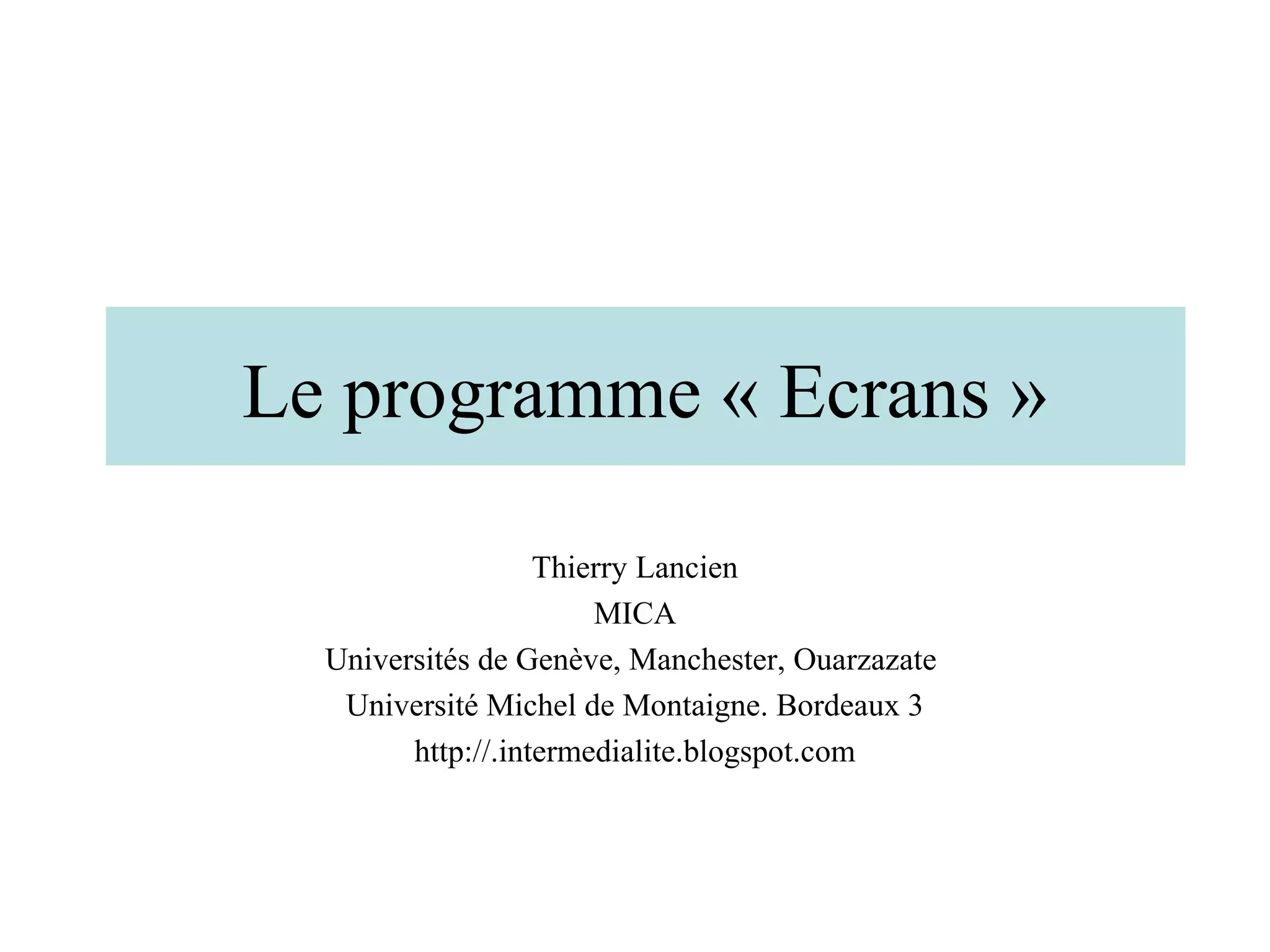 Le programme "écrans" explore l'impact de la multiplication des écrans sur les images et les postures spectatorielles à travers des séminaires organisés à Genève, Ouarzazate et Manchester. Il aborde des concepts tels que l'hybridation des médias, les transformations de l'expérience spectateur et les implications des technologies numériques sur la perception des images. Le document remet en question les relations traditionnelles entre spectateurs et images à l'ère des écrans variés, en soulignant une nouvelle forme d'intermédialité.