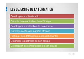 La formation pour les leaders d'équipe se concentre sur le développement des compétences de leadership, la communication, la motivation, et la gestion des conflits. Elle comprend des jeux de rôles, des tests de profil et un suivi sur trois mois pour garantir l'alignement avec les objectifs professionnels. Les sessions se dérouleront tous les vendredis de 18h30 à 20h30 à MB Alliance, débutant le 20 mars.