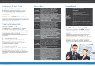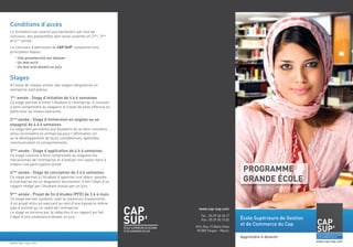 Le document présente le programme Grande École de Cap Sup, une école supérieure de gestion et de commerce au Maroc, accessible aux bacheliers par voie de concours. Ce programme inclut des stages obligatoires à chaque année, et l'acquisition de compétences en gestion et en spécialités comme le marketing et la comptabilité. Les étudiants obtiennent un diplôme bac+3, suivi de masters spécialisés en bac+5 pour approfondir leurs compétences professionnelles.