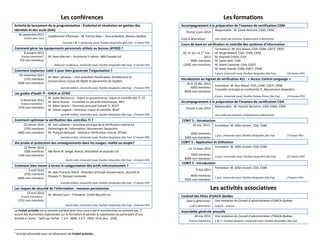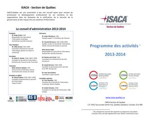 ISACA-Québec est une association à but non lucratif dédiée au développement professionnel dans les domaines de la vérification, sécurité, gouvernance et gestion des risques des systèmes d'information. Le document décrit le programme d'activités pour 2013-2014, incluant des conférences et des formations sur divers sujets liés à la technologie de l'information. Il fournit également des détails sur le conseil d'administration et les tarifs des événements pour les membres et non-membres.