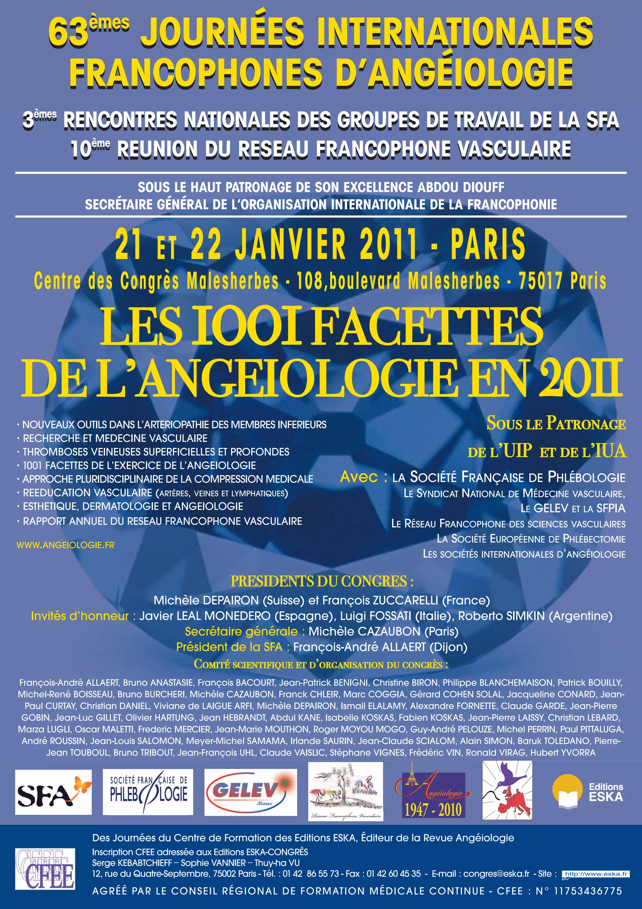 Les 63èmes journées internationales francophones d'angéiologie se sont tenues les 21 et 22 janvier 2011 à Paris, réunissant des experts de plusieurs pays autour de thèmes variés tels que l’arteriopathie des membres inférieurs, les thromboses veineuses et l’angiologie esthétique. Le congrès a proposé des conférences sur les derniers outils et traitements en médecine vasculaire, ainsi que des échanges sur les avancées scientifiques dans ce domaine. Les participants ont également assisté à des séances dédiées à la pluridisciplinarité et aux innovations thérapeutiques, soulignant l'importance de la collaboration entre les spécialistes.