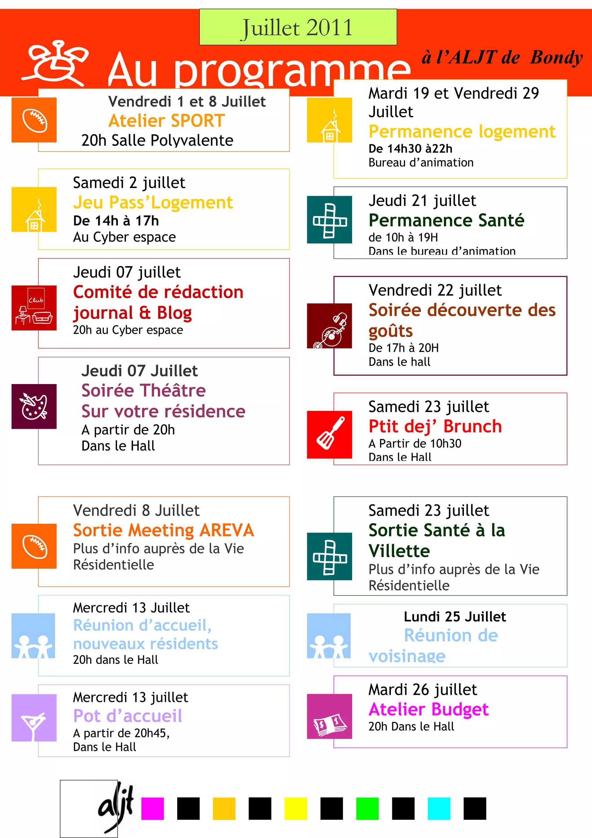 Le document présente le programme d'activités et d'événements de juillet 2011 à Bondy, incluant des ateliers sportifs, des permanences santé et logement, ainsi que des soirées découvertes et théâtre. Plusieurs dates et lieux sont mentionnés pour diverses activités destinées aux résidents. Des réunions d'accueil et d'information pour les nouveaux résidents sont également prévues.