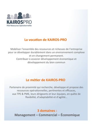 Le programme Kairos-Pro vise à soutenir les TPE et PME en mobilisant des ressources pour optimiser leur développement économique et leurs processus internes. Il propose des outils variés tels que des packs de services dédiés à la gestion des ressources humaines, à la formation professionnelle, et à l'amélioration de la performance commerciale. Les interventions sont réalisées par des consultants expérimentés, favorisant ainsi une approche sur mesure et collaborative pour répondre aux besoins spécifiques des entreprises.