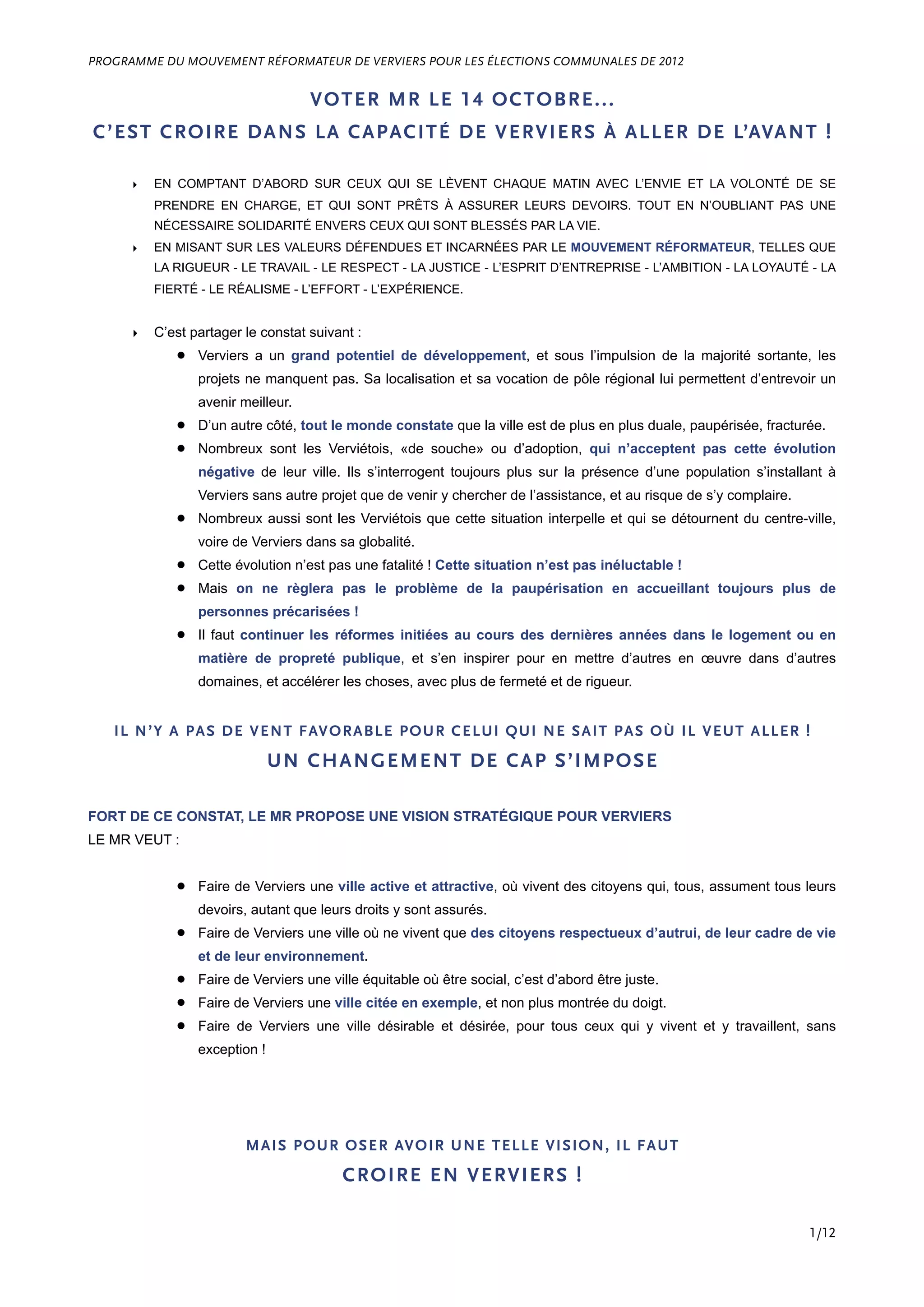 Le document présente le programme du Mouvement Réformateur pour les élections communales de 2012 à Verviers, mettant en avant des valeurs telles que la solidarité, la justice et l'efficacité dans la gestion municipale. Il aborde des enjeux majeurs comme le logement, l'économie, la mobilité et l'intégration des nouvelles populations, tout en prônant des réformes pour améliorer la qualité de vie des citoyens. Le MR appelle à redynamiser la ville face à des problématiques sociétales et économiques croissantes, en créant un environnement favorable au développement et à l'emploi.