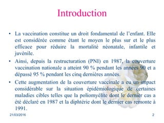 Le programme national d’immunisation (PNI) au Maroc vise à vacciner les enfants de moins de 5 ans et les femmes en âge de procréer pour réduire la mortalité infantile. Depuis sa restructuration en 1987, la couverture vaccinale a atteint 90 % et a dépassé 95 % ces dernières années, contribuant à l'élimination de certaines maladies comme la poliomyélite et le tétanos néonatal. Le PNI inclut des stratégies variées pour atteindre les populations, telles que la vaccination fixe, mobile et des mini-campagnes.