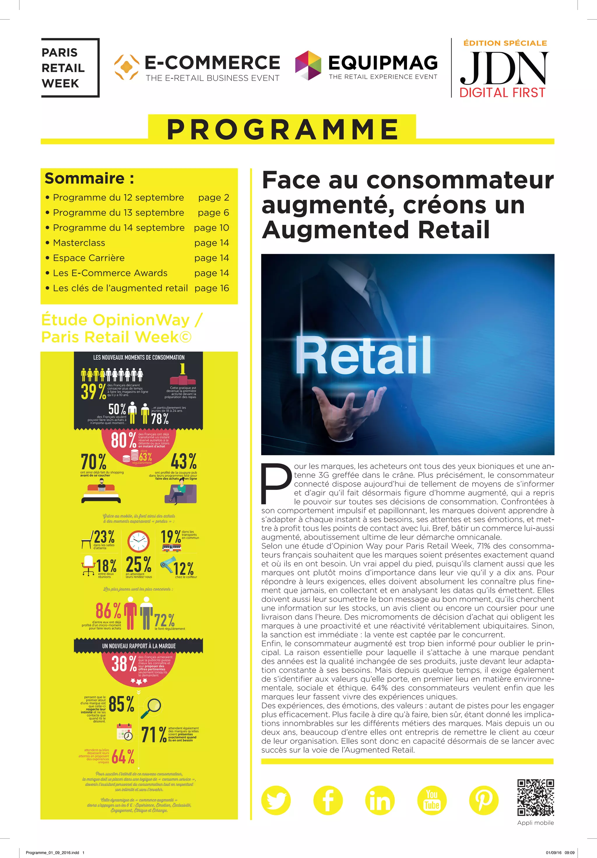 Le document présente un programme d'événements et de masterclass axés sur l'évolution du commerce face à un consommateur de plus en plus connecté et exigeant. Il souligne l'importance pour les marques d'adapter leurs stratégies à des attentes personnalisées et en constante évolution, tout en intégrant des valeurs éthiques et environnementales. Enfin, il en appelle à l'utilisation d'analyses de données pour optimiser l'expérience client dans un environnement omnicanal.