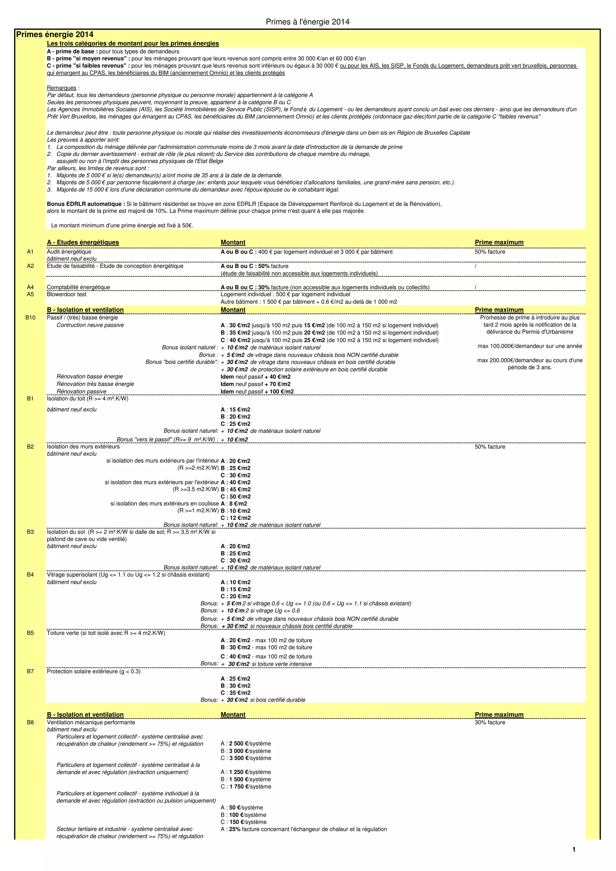 Le document détaille les primes énergie 2014 en Belgique, classées en trois catégories selon les niveaux de revenus des demandeurs. Les primes sont destinées à encourager des investissements économiseurs d'énergie dans divers secteurs, notamment l'isolation, le chauffage et l'utilisation d'énergies renouvelables, avec des montants et conditions spécifiques. Les critères d'éligibilité incluent des exigences de preuves financières et des plafonds de primes en fonction des types de demandes.