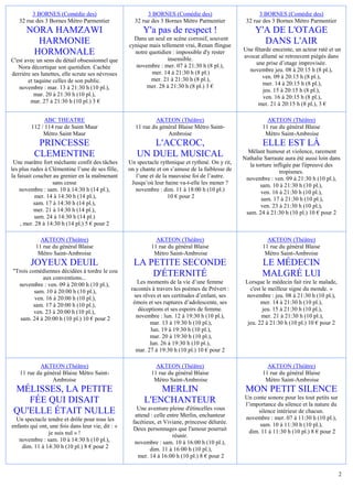 Le document détaille une série de spectacles et événements culturels, incluant des informations sur les dates, tarifs et modalités de participation financière pour la solidarité. Il mentionne divers spectacles à Paris, comme 'Jet Lag' et 'Y'a pas de respect!', en précisant les lieux, horaires et prix des billets. Une contribution est également demandée pour soutenir une association à travers l'achat de billets.
