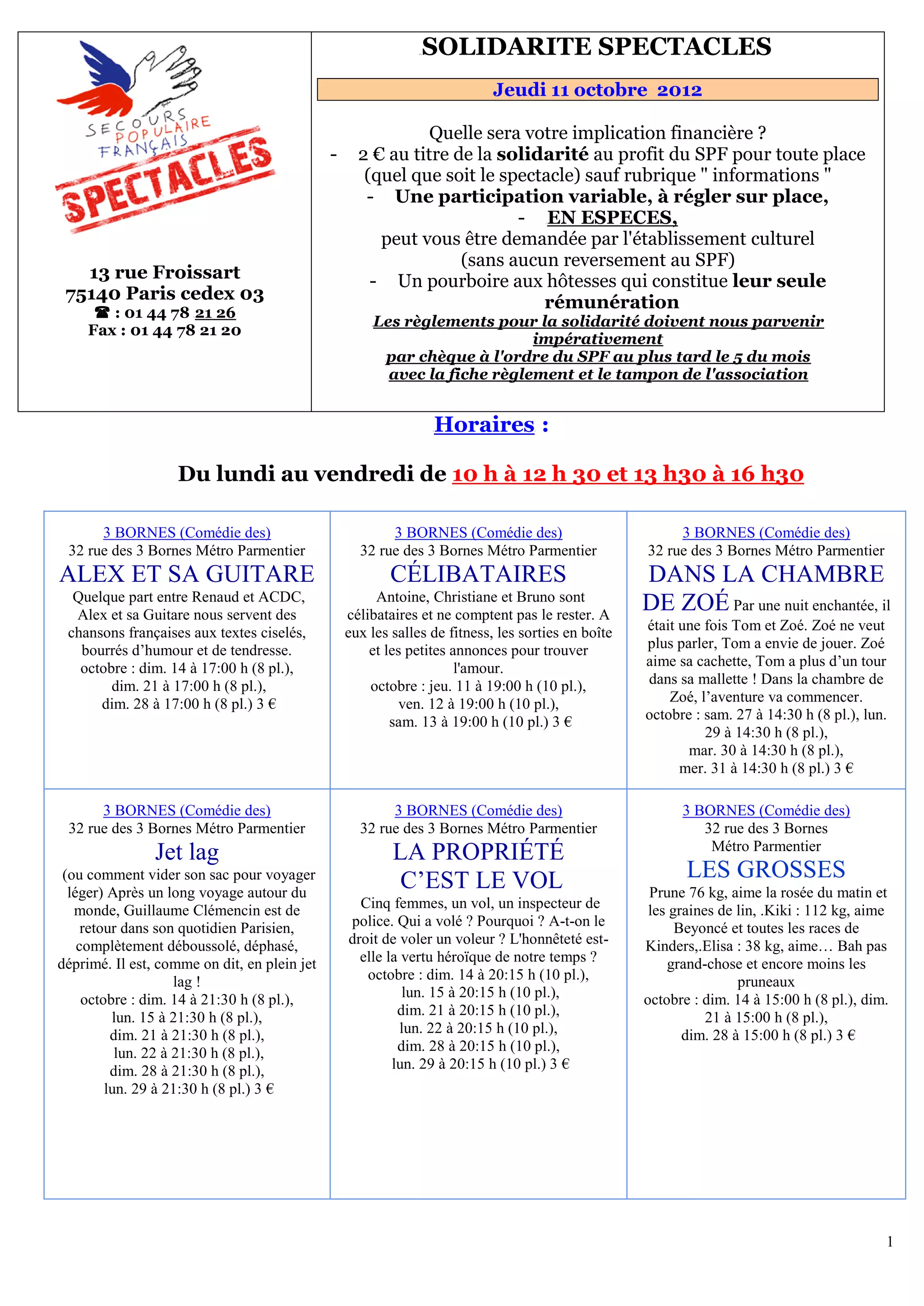 Le document présente une série de spectacles et événements culturels, incluant des informations sur les prix, les horaires et les lieux de représentation. Il mentionne également des modalités de participation financière au profit d'une association, ainsi que des détails sur divers artistes et productions théâtrales. Les titres et descriptions mettent en avant la diversité des événements proposés à Paris durant le mois d'octobre 2012.