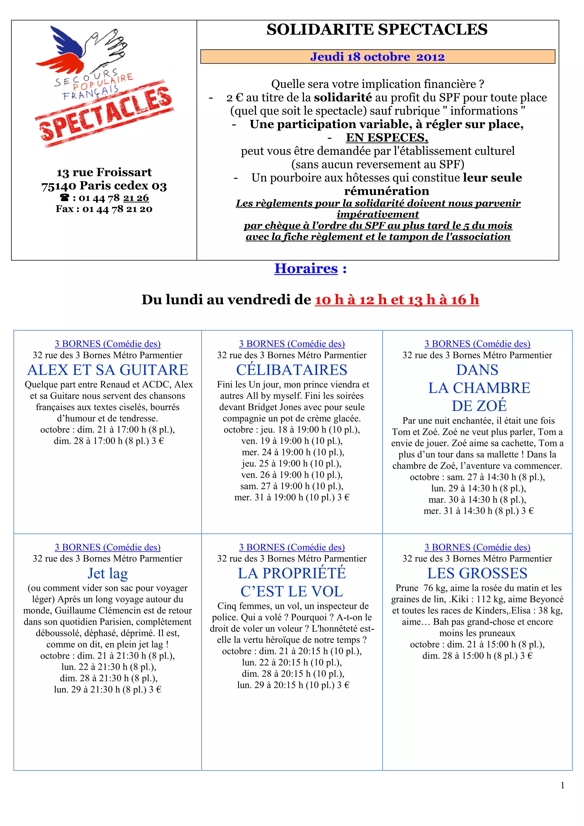 Le document présente des informations sur des spectacles et des activités culturelles à Paris pour octobre 2012, avec des détails sur les tarifs, la solidarité financière, et les horaires des représentations. Plusieurs spectacles divers sont mentionnés, incluant des pièces de théâtre et des performances musicales, et il y a des indications sur les règlements à effectuer pour la participation. Les événements se déroulent dans différents lieux culturels, avec des précisions pour les réservations.