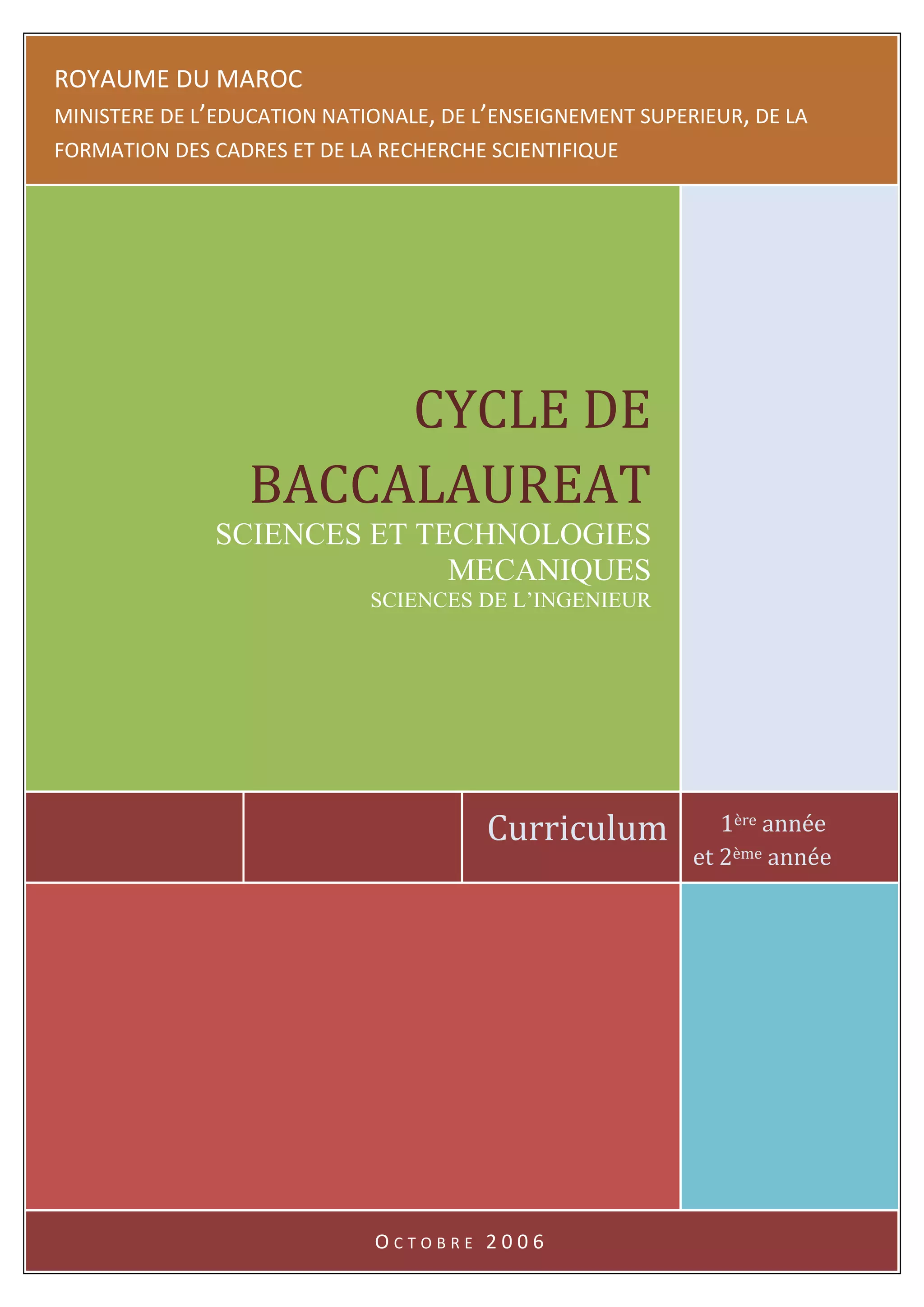 Le document présente le curriculum des baccalauréats en sciences et technologies mécaniques du Maroc, soulignant l'importance des compétences technologiques et l'intégration des activités pratiques. Il décrit les objectifs éducatifs, les caractéristiques du programme, et les méthodologies d'enseignement adoptées pour préparer les élèves à un environnement industriel compétitif. L'accent est mis sur l'importance des technologies de l'information et l'approche systémique dans la conception du curriculum afin de développer des élèves capables d'innover et de collaborer efficacement.