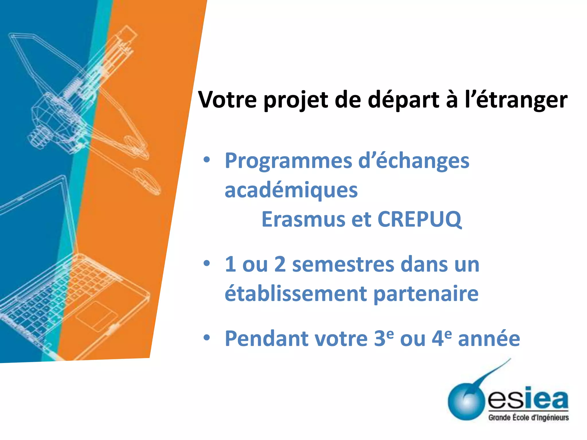 Le document décrit les programmes d'échanges académiques Erasmus et CREPUQ permettant aux étudiants de passer 1 ou 2 semestres à l'étranger dans des universités partenaires. Il fournit des détails sur les critères de sélection, les étapes de candidature, et les destinations en Europe et au Québec. Des contacts et ressources pour aider les étudiants dans leur démarche internationale sont également mentionnés.